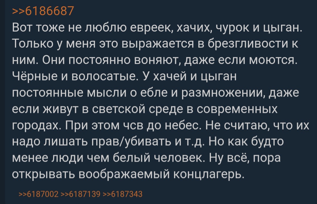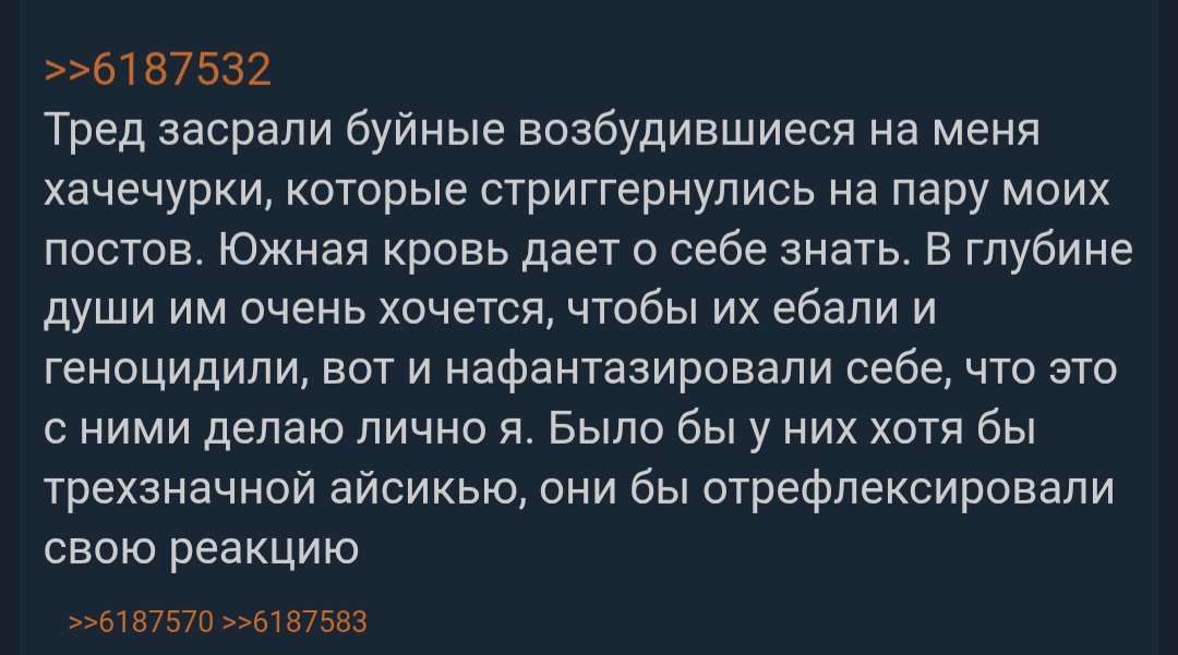 >>6265512 Ты их тащишь в массы и за это теперь огребаешь. Я понимаю, извращенцы порой путают берега и варясь в кругу себе подобных порой забывают, что в адекватном общество за это подвергают остракизму. Так мы тебе напомнили. На тяначе ты не имеешь право унижать женщин других наций и развиться на фоне их страданий. По крайней мере за пределами гл, а в гл делайте что хотите, я уде поняла, что лесбы не совсем союзники тян, а что-то недалекое от чушков, разве что менее опасные.