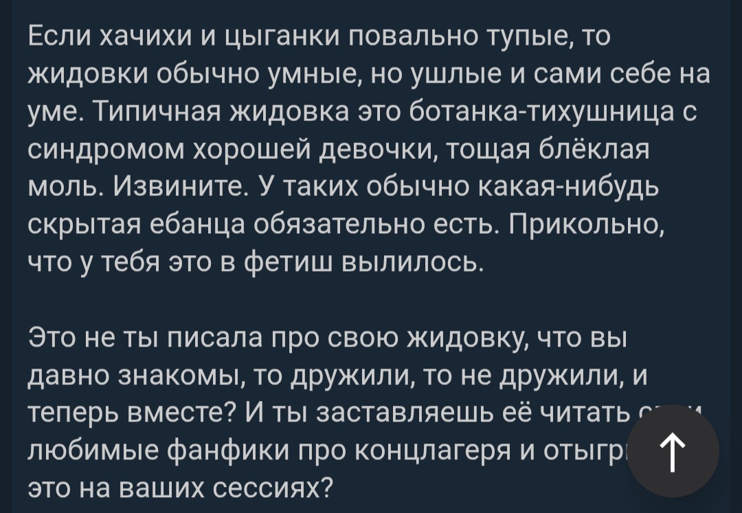 Ндам. Странно еще, что та, кто из нацилесбы вытягивал про ее фетиши, больше не появлялась. Неужели один шиз эту многоходовочку спланировал? Развести лесбу на откровения о фетишах, заклеймить ее наци и мизогинкой, а потом из треда в тред это повторять как заезженную пластинку, попутно пропагандируя традлайф и плодячку. И вот эта хуйня кормится с моих налогов, пиздец.