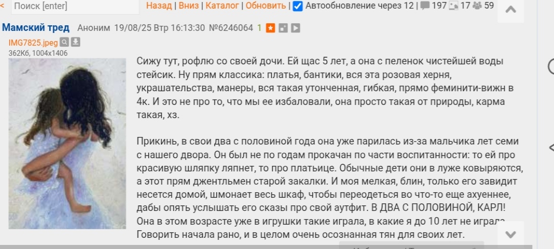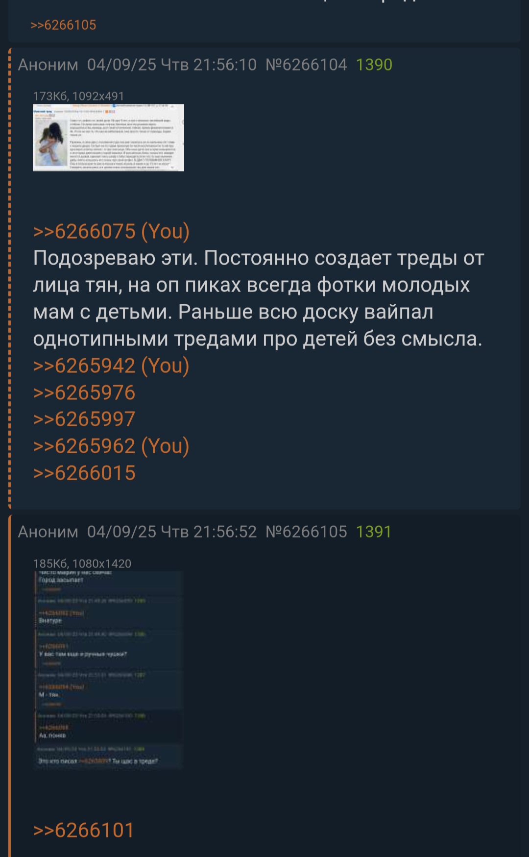 >>6266075 Подозреваю эти. Постоянно создает треды от лица тян, на оп пиках всегда фотки молодых мам с детьми. Раньше всю доску вайпал однотипными тредами про детей без смысла. >>6265942 >>6265976 >>6265997 >>6265962 >>6266015