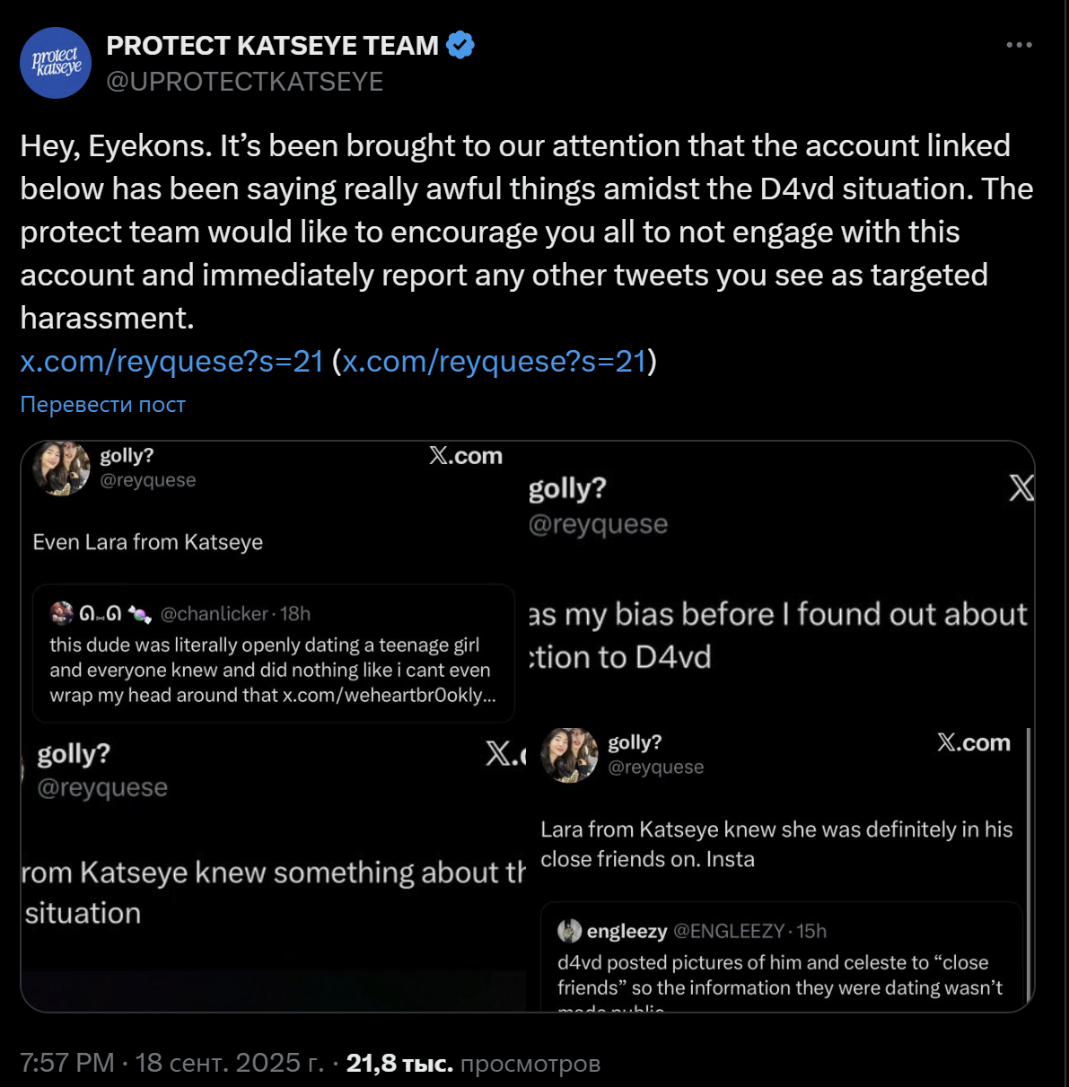 >>6291970 >про дружбу с предполагаемым убийцей d4vd все молчат Не понимаю, что здесь обсуждать, этот чел был популярный молодой музыкант, с мерчом, турами и некоторыми песнями в топе чартов. Как кэтсай Понятно почему они общались, то что он абьюзил ребёнка это пиздец, но какой коммент здесь может быть? Завтра sombr прибьет кого-то, а оправдываться нужно будет им? Не много ли ответственности на девушках, 4/6 даже совершеннолетия не достигли
