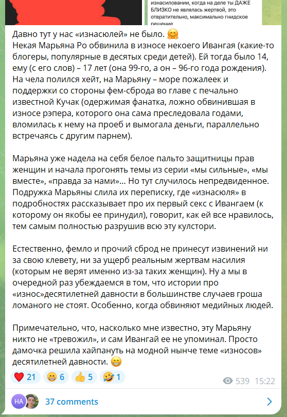 Им всем по хорошему нужно сконнектиться друг с другом и обсудить всё с позиции взрослых людей, где-то попросить прощения, где-то самим простить других за ошибки молодости кроме насильника педофила ивангея. Но тогда всего этого шоу не будет, пынямаю, охватиков такое не принесёт.