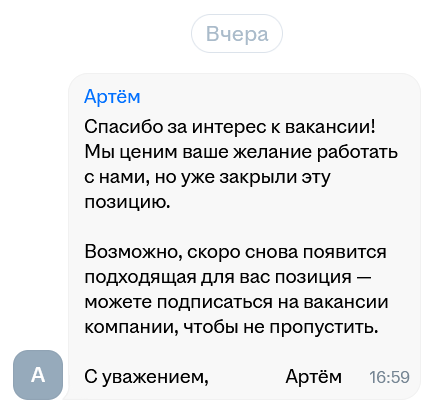 >>6291123 Так десятки отказов без объяснений это база для большинства сфер. Ну типа нормой считается, что 1 из 10 откликов заканчивается переходом на следующий этап: тестовое, звонок эйчарки, что-то еще. Если отказов больше - значит нерелевантное резюме или еще какой-то косяк. Меньше будет только в узких сферах, где 3.5 вакансии и столько же кандидатов.