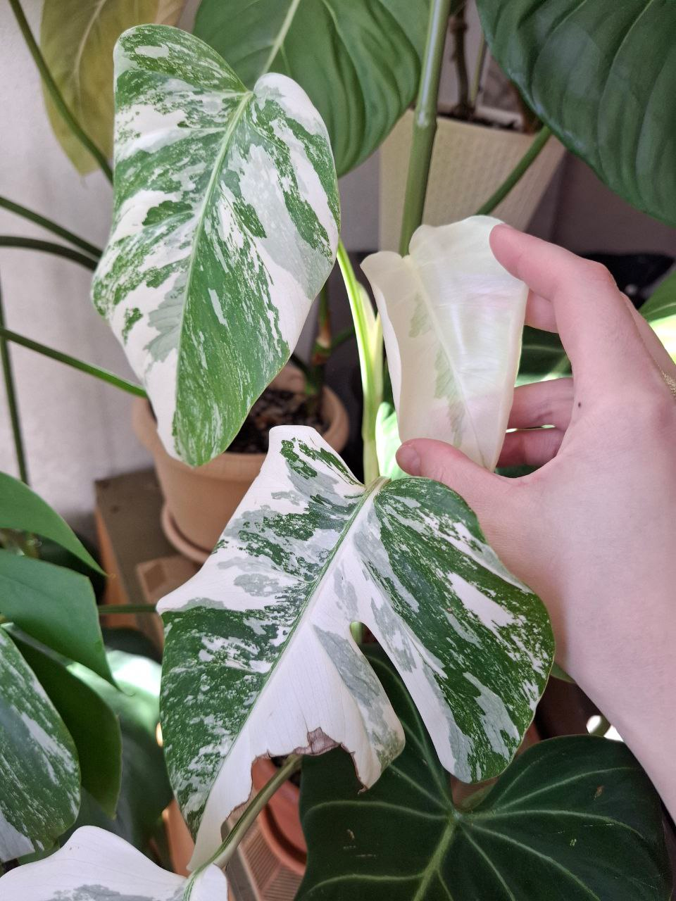 По традиции открывает тред всё та же вариегатная монстера! >>5691252 → Монстера была найдена на помойке вытянувшейся и почти полностью зелёной. Самый удачный черенок остался вариегатным, пожил на моём тёмном окне, а потом был подарен подруге уже как вполне взрослое растение. А спустя время подруга его начеренковала и подарила детку мне обратно. Круговорот монстеры в подружестве! Как видите, я с подсветкой не заморачиваюсь, цветок стоит на тумбочке напротив южного окна, но белые части ожидаемо помирают. И тут эта суецыдница выдаёт накануне зимы почти полностью белый лист...