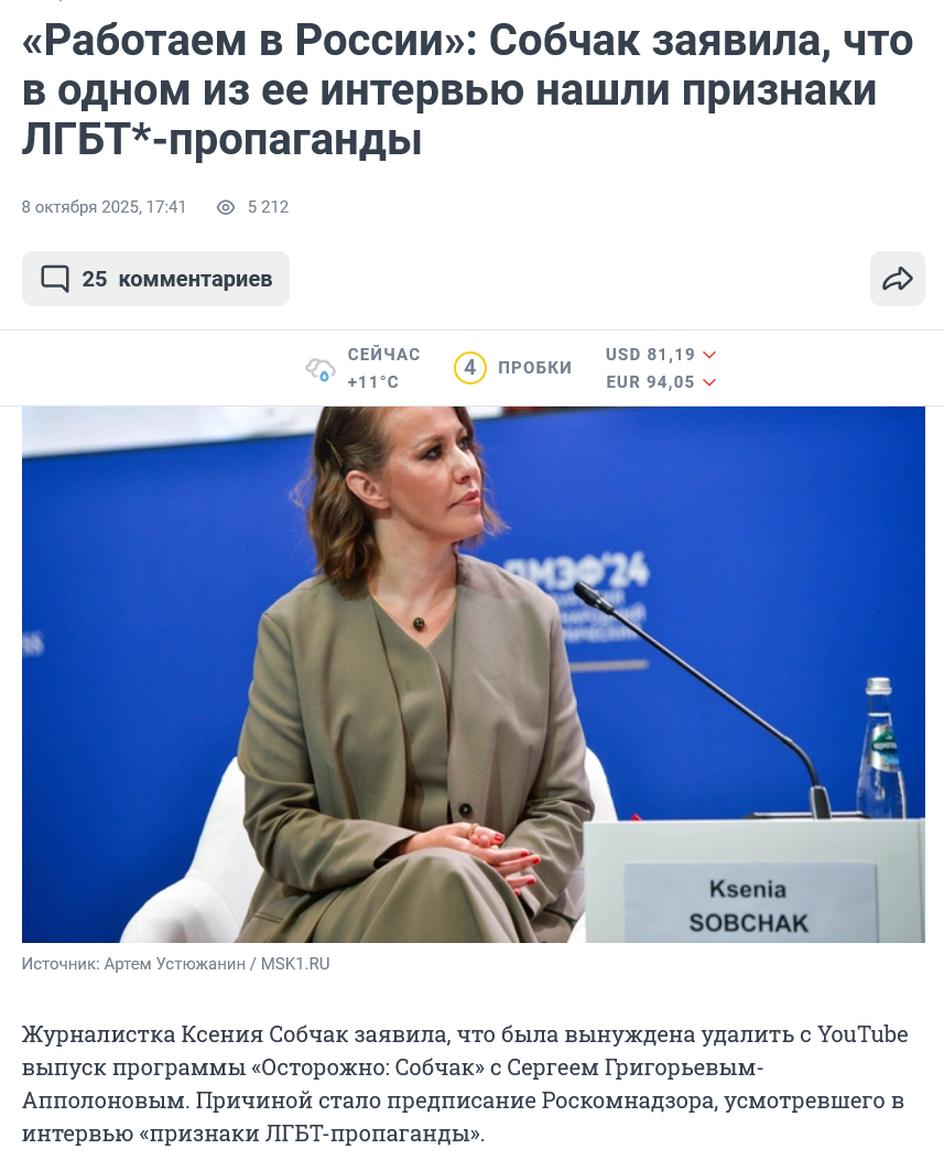 Кстати, все-таки Собчак удалила с канала интервью с Серегой. Вот. Роскомнадзор сказал удолить. А я еще удивлялась, разве не посчитают такое пропагандой.