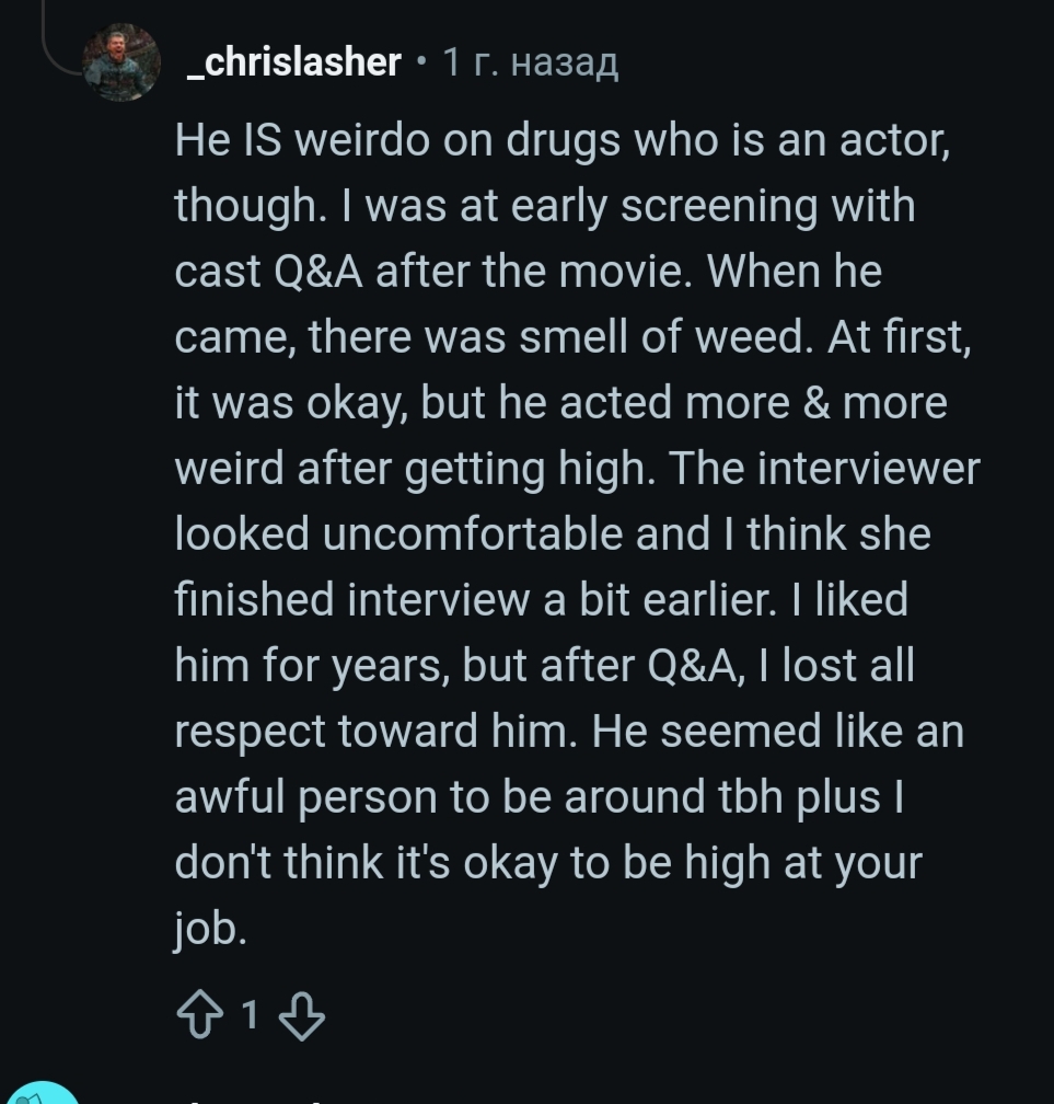 >>6311506 Хз, прост из тиктока и гугла... Про переедания читала, что для съёмок в нитраме он должен был похудеть, но наоборот разъелся из-за компульсивного, не могу найти. Ну может это всё пиздёж, но как будто нет