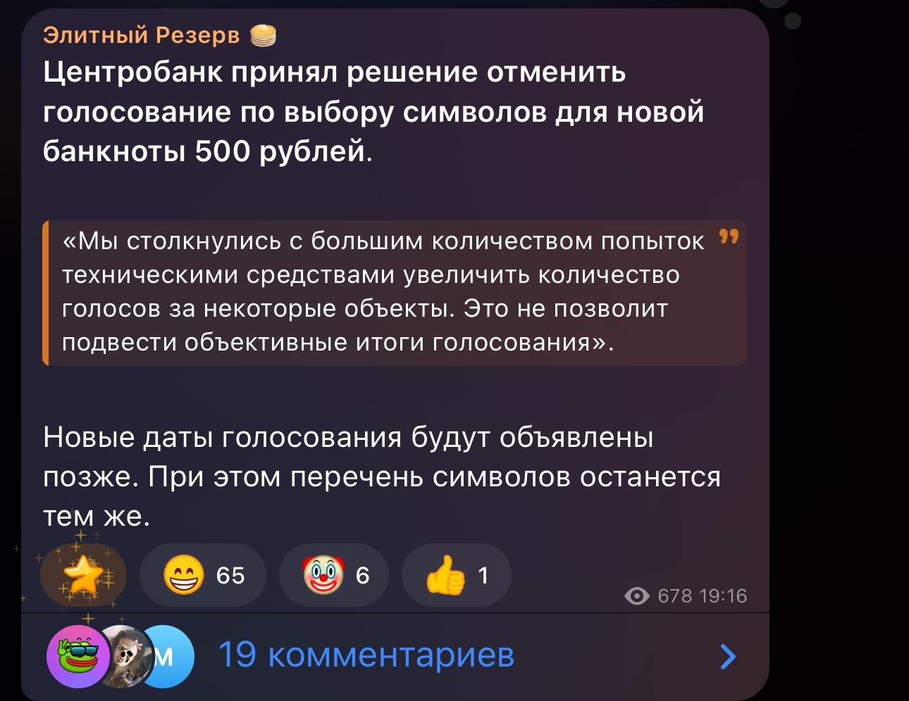 ЦБ России отменил голосование за символы новой банкноты 500 ₽ из-за массовых накруток. Центробанк заявил, что фиксировал многочисленные попытки фальсификации результатов, поэтому процедуру приостановили.
