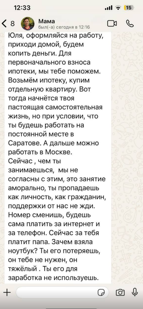 Зачем штаны белые надела, ты их запачкаешь, зачем тебе телефон ты там все равно ерундой занимаешься, лучше к тете глаше в киоск устроилась бы, ну и куда тебе такие туфли ты понимаешь что ноги переломаешь, все равно ходить в них не умеешь, дурашлепа. Вот такого порядка ее предки пришибленные. Как вы не понимаете. Они и есть корень проблемы - гиперопека, постоянная критика, внушение что она сама дура и ничего без них не может, ничего не смыслит, ничего у нее не получится, манипуляции. Тьфу нах. Неужели вы не видите??