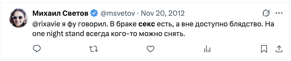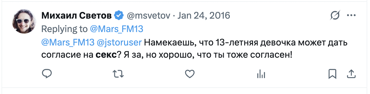 >>6310020 Да думаю ближайший год будет много интересного по Светову, новый сезон сериала о педоскуфе и подстилках. Они рано или поздно разойдутся, я думаю светов даже алименты будет платить, чтоб в интернете ничего такого не подумали, но подберет другого голодного ребенка с улицы и заманит едой в свою скуфожизнь и так по кругу, только наверное больше без деточек. Он же в твиттере писал даже что он слишком ранен леваками чтобы иметь детей. Этого наверняка незапланированно обнаружили, мб эта еще презики прокалаывала. Учитывая что кольцо было после зачатия, а светов только недавно семенил в твиттере о том как не готов к детям, скорее всего так и было
