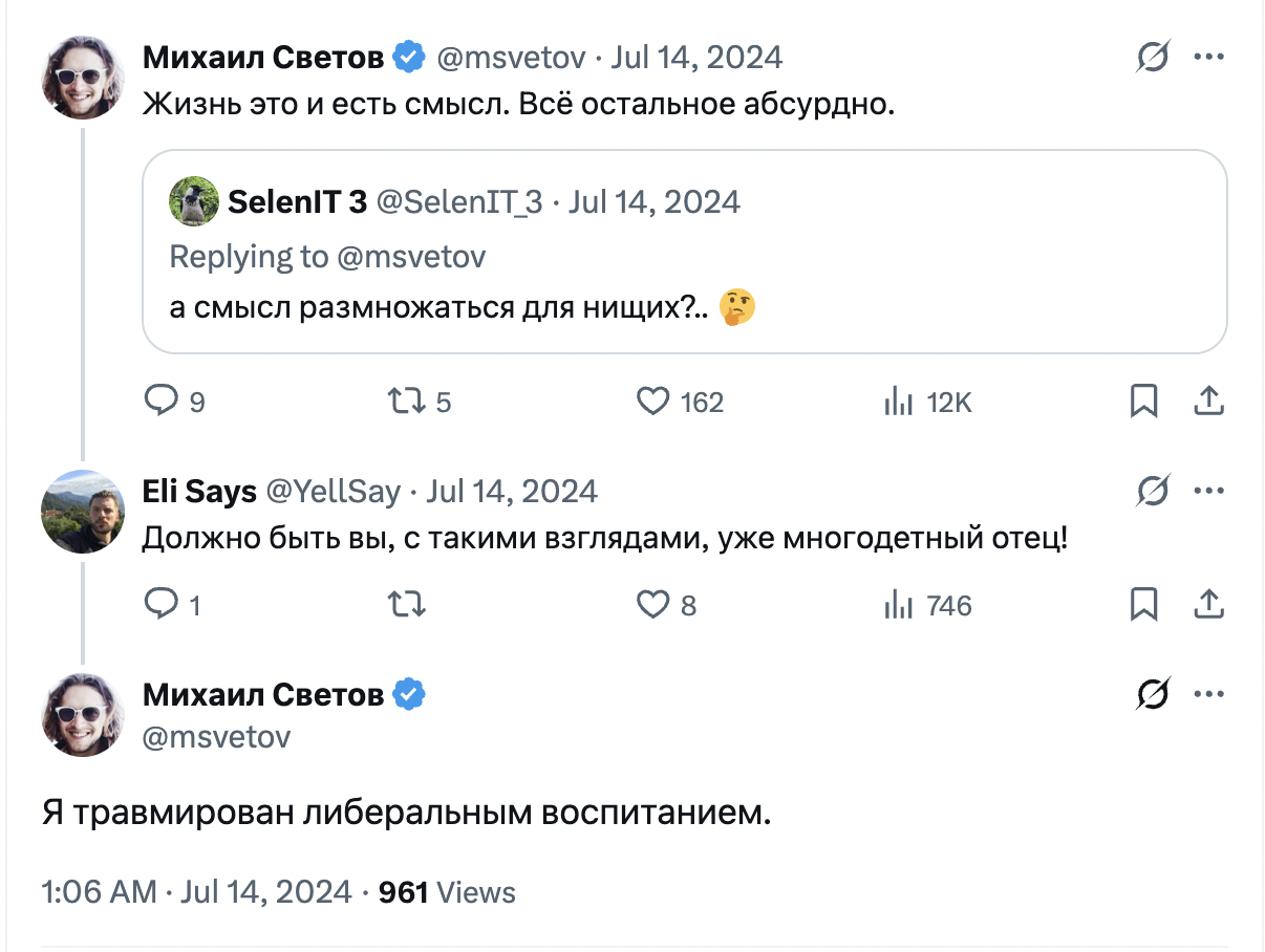 >>6310071 Ну так я и не про Светова. Вообще они (браки) разваливаются, мне кажется, потому что очень часто женщина почему-то навязывает мужику то, о чем он ее просить должен так-то. Я о детях в т.ч. Это со стороны женщины непропорционально больший вклад — выносить, родить и поднять ребенка. И пусть мужики не заливают, что им дети не нужны, их самих же кроет от мыслей, что они тупиковая ветвь своего рода. Я-то знаю.