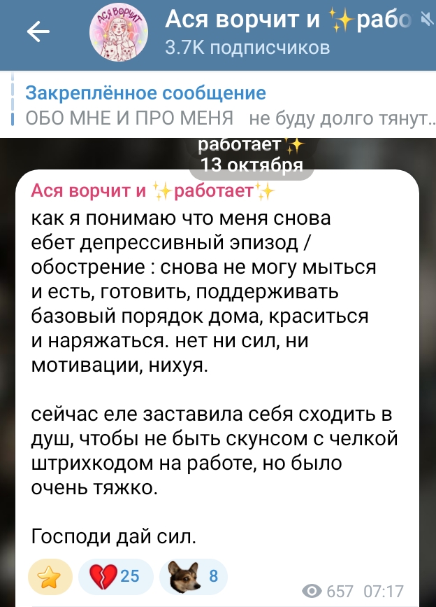 Как только Буба выходит на работку, случается депрессулька, а потом какой-нибудь переломчик или другая болячка, которую она себе успешно наедает. И снова на больничный чилить