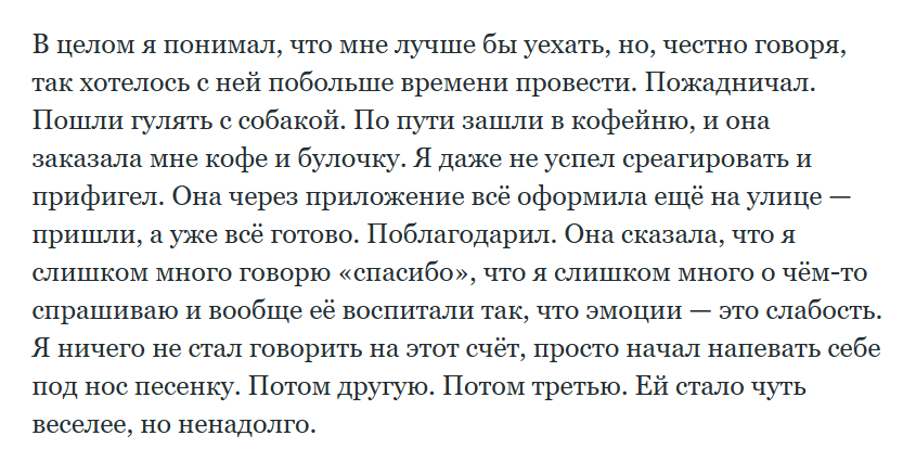 Кстати о вот этой дихотомии... Мальчик недавно повстречался, вроде, чснутый: жестко выспросил имя, контакты, не спрашивая лез помогать, сам куда-то тащит, предлагал морду набить чуваку, на которого я обиделась, ко всему еще и нарц прям классический. Но вот когда меня развезло, то весь вечер заботился: погреть там, придержать, обнимал очень ннжно и аккуратно, потом аккуратно посадил в такси и ... больше не писал( я вот думаю, а что, если это и было слционическое "заботливый"