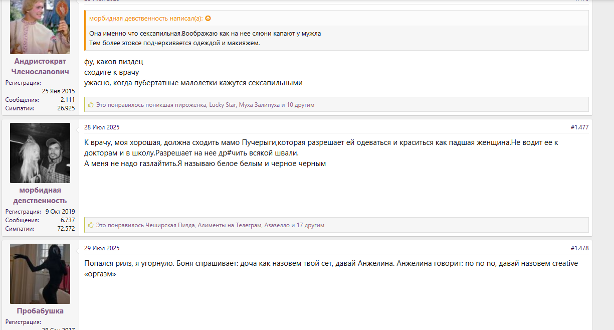 >>6310897 >Ну и в чем они не правы? В том что пишут какие-то ебанутые влажные фантазии про ребенка? Я не ханжа, но что-то не увидела на скринах никаких претензий по факту. В моем детстве 13-летние девочки точно так же хотели выглядеть старше, одевались не совсем по возрасту, еще и мода нулевых добавляла блядского вайба, дурачились, хотели нравится и бухали. Но большинство при этом не то что не ебались, а максимум там мечтали о каких-нибудь поцелуях с мальчиками своего возраста. Ну теперь вот у детей есть тик-ток, да, для взрослых кринжово смотрится когда ребенок танцует под треки с текстами уровня сосать это талант. Но как бы подростки в целом кринжовые, это нормально.