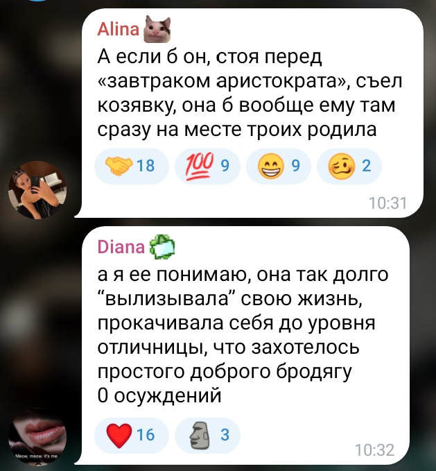 На их контент как на иглу подсаживаешься. Меня ещё не отпускает наблюдение за блогером, если там постоянно какой-то треш происходит, как у финес. Понятно, что у неё капитальные беды с башкой и нормальным человеком она уже не станет, но мне настолько интересно что ещё с ней произойдёт и чем это закончится, что не могу забить и перестать следить за ней.