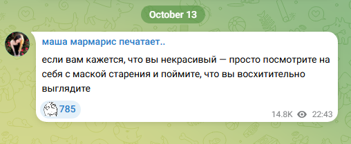 Она периодически удивляется, что кто-то из её ровесниц набрал большой вес или плохо выглядит. А те ровесницы это как раз замужние женщины с детьми, которые много работают. Она ещё не пользуется никакой косметикой и у неё отличная кожа лица. Она говорила, что наша общая знакомая плохо выглядит, потому что всю жизнь делала полный макияж каждый день и это очень влияет на внешний вид, типа косметика в перспективе уродует женщину. Я только тогда прикинула, что по идее в декоративную косметику какого только говна не добавляют и тоже сократила потребление косметоса.