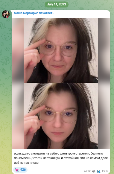 >>6312734 Без рофла, но я заметила что те женщины, которые никогда с мужиками не связывались выглядят молодо. Есть соседка околомусульманка (молится, пост держит, но одеваяется как обычночеловек, красится и т.д.) и короче ей 40+, но вайб и ощущение, что не больше 30-ти. Я во внешке сильно сдала именно из-за мужиков, точнее, от хуестраданий по ним