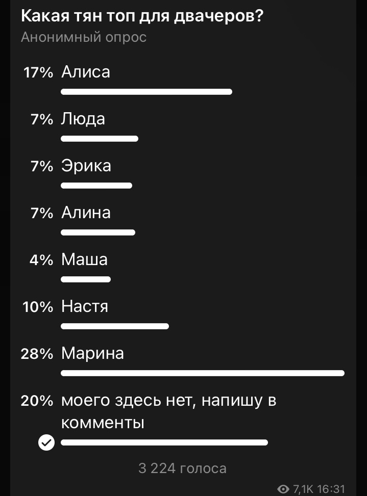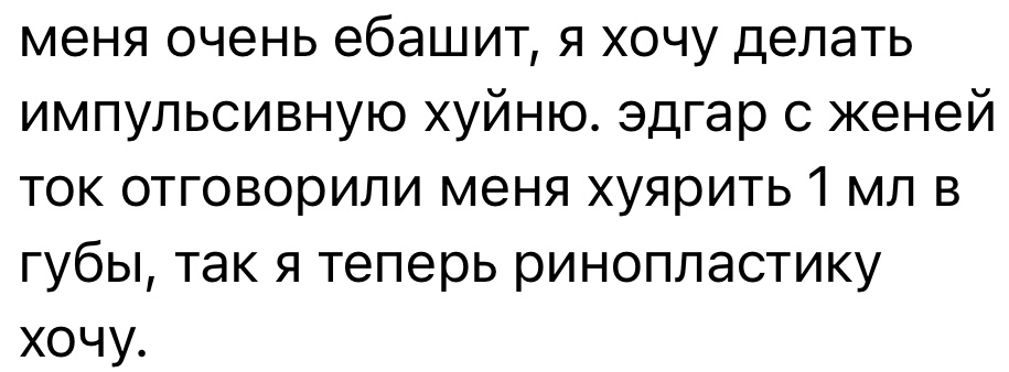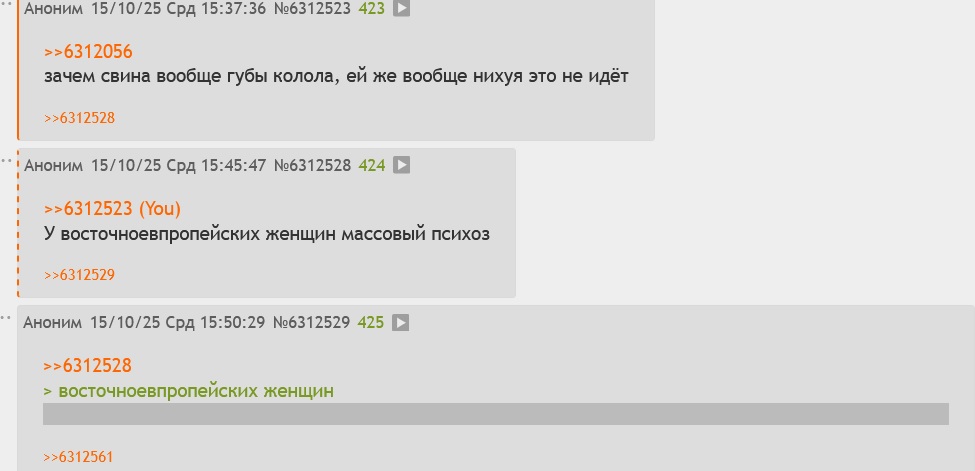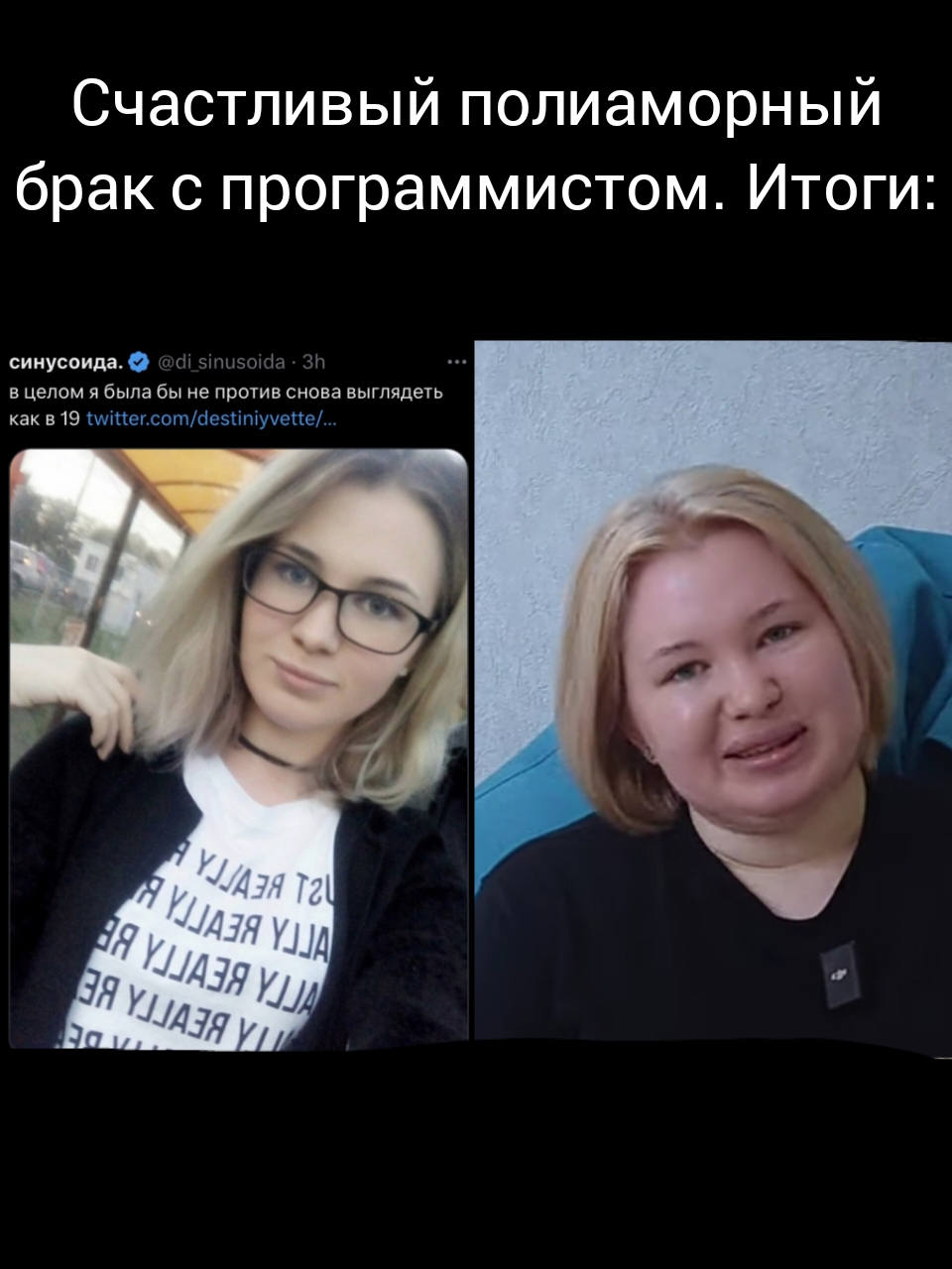 >>6311323 >Мне кажется за её жизнью так следят возрастные женщины, которые застали её по телевизору. Именно. Кстати, вот таких палатах, посвященных старым персонажам уровня ЖЖ обычно пасутся какие-то ультра-шизовые бабки. А в палатах по твиттерским вполне здравые тян. >На их контент как на иглу подсаживаешься. Меня ещё не отпускает наблюдение за блогером, если там постоянно какой-то треш происходит, как у финес Да-да, ну на финес мне тяжело смотреть, потому что это слишком жесткое разложение в прямом эфире, на женщинах мне такое неприятно. Даже за людьми уровня штрохи слежу. Из таких только "Мама я в сибири" могу выносить. >>6311334 >Кто? Я долго следила за всякими админами из плюма, теперь за телеграмскими немного, дохуя лесботян (ну они около-нормиски все), там лавхейт пополам, сейчас подсела на телегу транса-свошника, забавно срется с дрочерами, торгует еблом, вангую от него жирок.