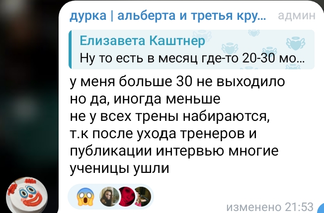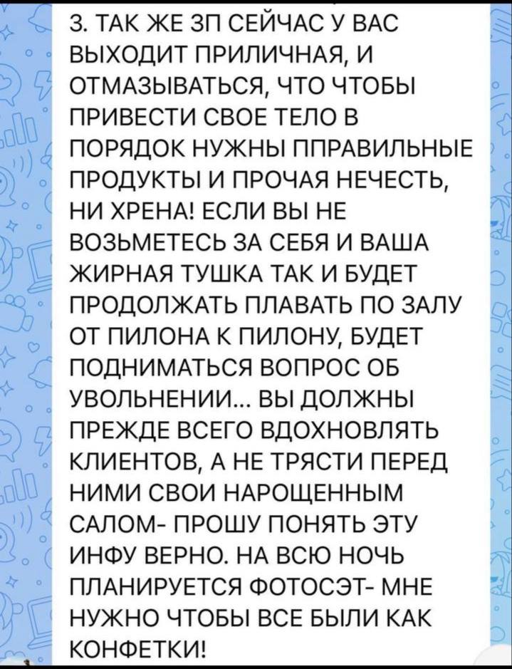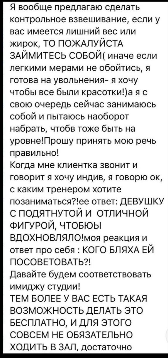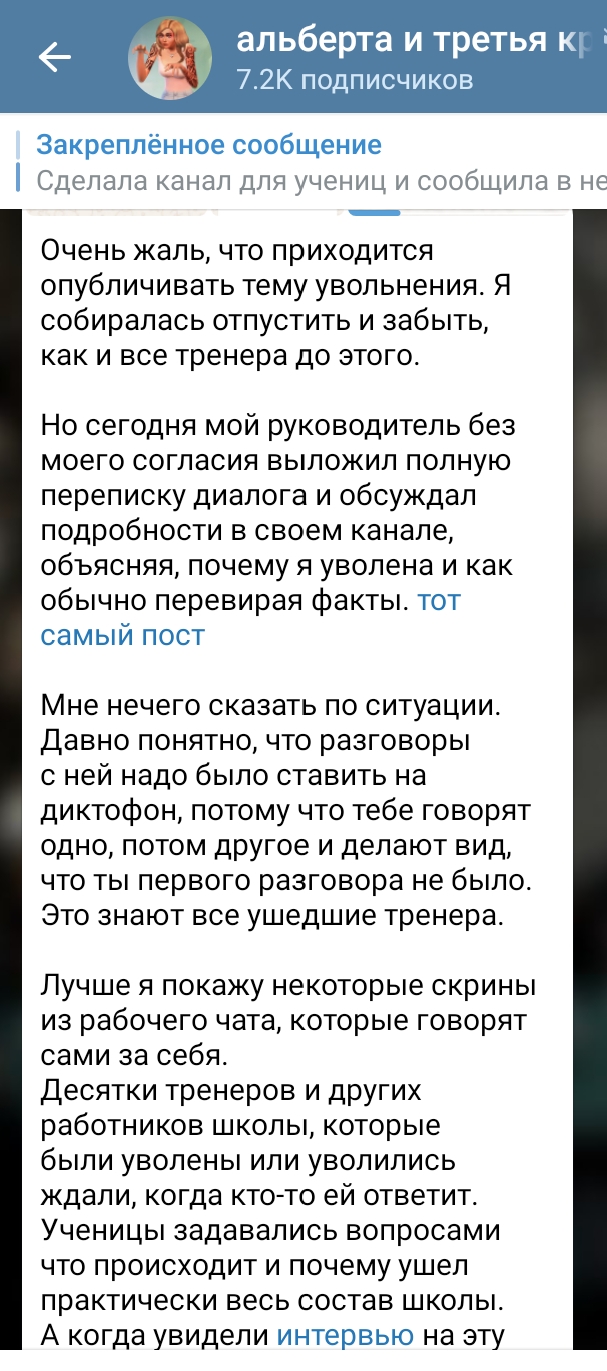>>6312726 Не, там короче на 12 минут голосовухи у этой начальницы. Если вкратце, Альберта подошла к начальнице по поводу повышения на неформальном мероприятии, та сказала, мол да, ок. Потом забрала слова обратно. Альберта напомнила ей и сказала мол, ну если ты выпила, скажи, что не подумала, выпила, все такое. Начальница сгорела с этого. Альберта ей сказала, что та позволяет себе разные высказывания про свисток, жирух, ну и в принципе общение между ними всеми скорее неформальное, без реверансов и какой-то субординации. Начальница сказала, мол, все, увольняйся. Я посмотрела тг начальницы (toxic boss кстати название )она там действительно как с подружками общается, входит в зал "привет члюшки", подходит к очень высокой девушке говорит "ну рост для сосания" (про себя)
