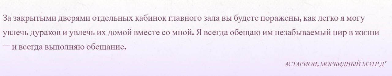 – Ни слова про сексуальную травму или то, что охотников принуждали спать с жертвами. Астарион заманивал дурачков во дворец, обещая им пир.