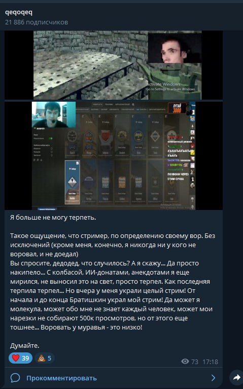 Вротишкин у себя в тг возмущается, почему это вдруг аудитория меньше заходит на его стримы, и написал пост, убеждённый, что дело в том, что у него донатов на стриме оказывается слишком много и надо ставить какие-то ограничения/правила на них.