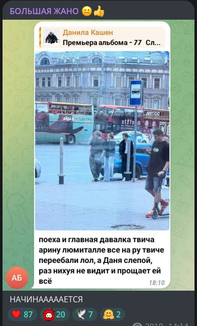 >>6320723 — "Видел историю с твоим бывшим менеджером?" нет, не видел, с каким? "Шубин Вадим" а, этот который тачку у Тушенцова украл, а че там, он накосячил опять? "Паспорт слил, номер слил" Тушенцов паспорта сливает..? "И адрес ещё!" адрес родителей? Че за хуйня? "Там адрес, юз, номер его и его матери" Пиздец.. Честно, не знаю, должна ли мать отвечать за поступки её сына.. Ну у Шубина крутая мать, она директор в одной школе. Я с ней пересекался разок, у меня есть история как я накосячил! Короче, я снимал ролик про Фэйса, и там такой сюжет, что продюсер Фэйса пробил ему концерт в школе, и мы пришли снимать сценку в эту школу, а это была школа где директор - мать Шубина! Я по факту сам накосячил, но мне так влетело пиздец. Родители увидели, что в школе там матюки снимали и в некой ярости были.. Но в итоге все хорошо обошлось, ролик я не удалил принципиально. Ну короче я хуй знает, это странно, матерей сливать.. "Ты извинился хоть?" конечно! Я написал Вадиму, сказал: «Устройте родительское собрание, я извинюсь перед всеми» потому что понимал, что ей может очень влететь за это, но в итоге она ничего не стала делать, все обошлось. Короче, это мразотский поступок - сливать родителей.. Я, как человек, который сам пережил слив родителей не могу сказать что это хуйня, как-то поддержать этот поступок, понимаете? "Мама Вадима вроде даже не знает, что её сын натворил" да конечно, Вадиму же больше 30 лет уже блять! Конечно мама за него не отвечает, о чем речь? - Даня