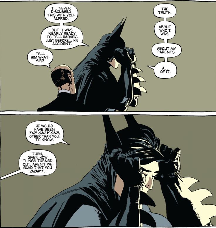 Поняла еще, что все споры про оос бессмысленны. Я уже столько вариантов взаимоотношений дик и брюса прочитала и ни один не вяжется с другим на 100%, нет никакого каноничного характера бэтмана и робина, кроме совсем общих черт. Они все переписывают бесконечно и каждый новый сценарист срать хотел походу, что там раньше было с персом. Но меня повеселила общая константа в виде брюса, который серьезно всем говорит, что дик его напарник в 9/12 лет, а не сын Это такой фансервис для детей? Сценаристы понимают как странно это звучит? и все нормальные взрослые типо Джима и Альфреда в ахуе