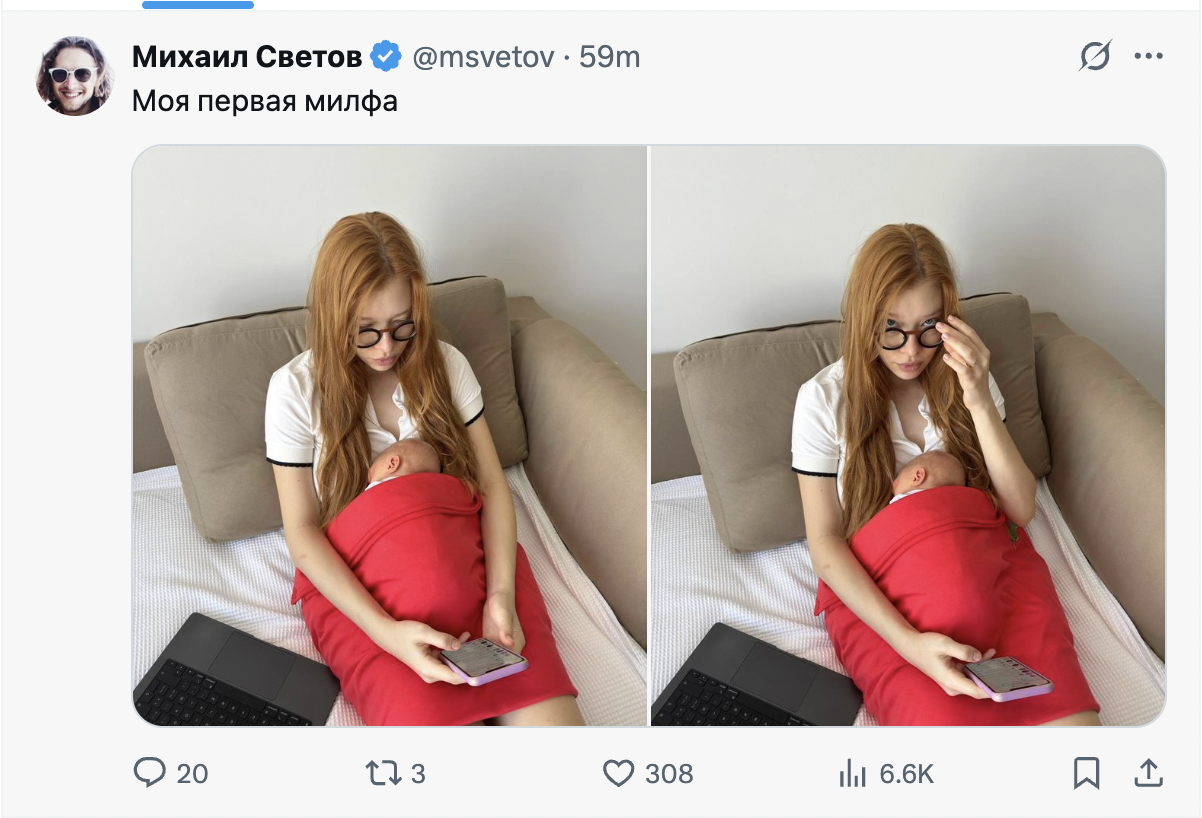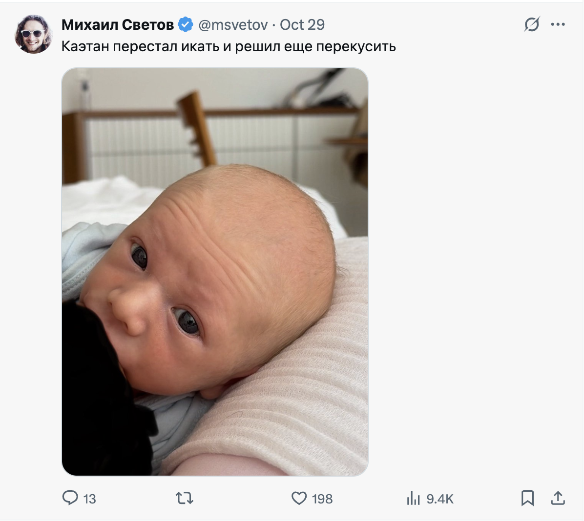 У Светова есть другая одежда или он эту рубашку вообще не снимает? и нахуя фоткать сиську в процессе кормления, ребенок только вылупился а уже скуф с морщинами