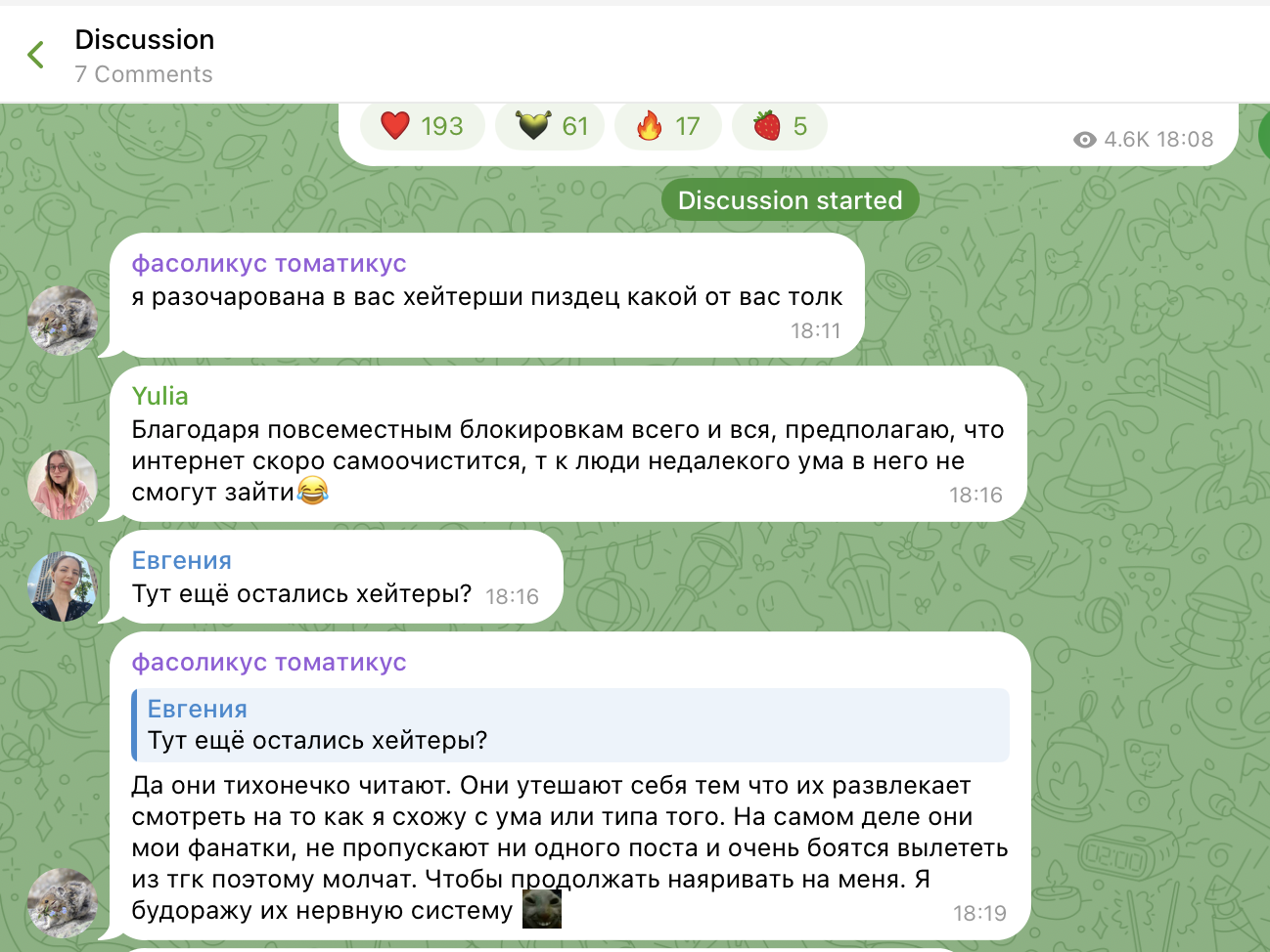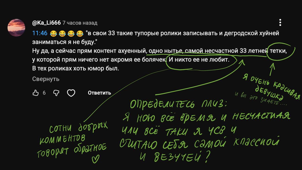 Все, крайняя стадия шизы. Уже несколько дней подряд мусолит комменты комменты давайте обсудим комменты давайте анализировать ох какие хейторы не терапевтированные, ух, давайте обсудим в очередной раз и полижем мне жопку