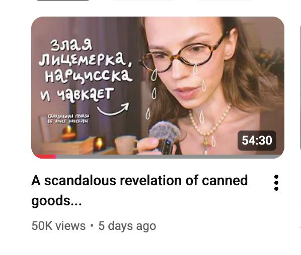 >>6325145 Вообще Консерва надеялась этим видосом повторить успех видео про расставание, которое набрало много просмотров, пожалеек, и она по её же словам поимела с расставания профит. Только вот последнее видео за 5 дней собрало обычное кол-во просмотров, похайпить не получилось. Ну и после расставания людям действительно было её жаль, а сейчас она выглядит неадекватной шавкой, которую не то что жалеть, а даже слушать не хочется. Она реально сходит с ума как одинокая старуха и это страшно.