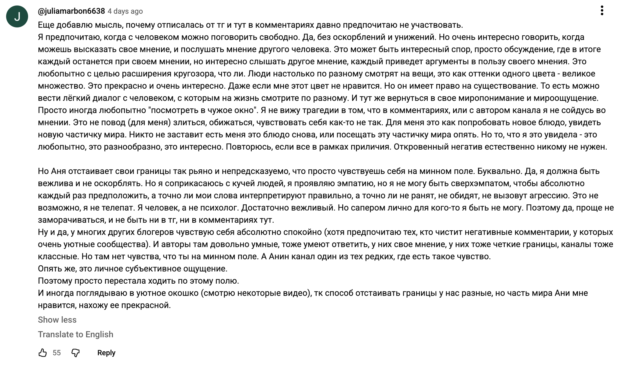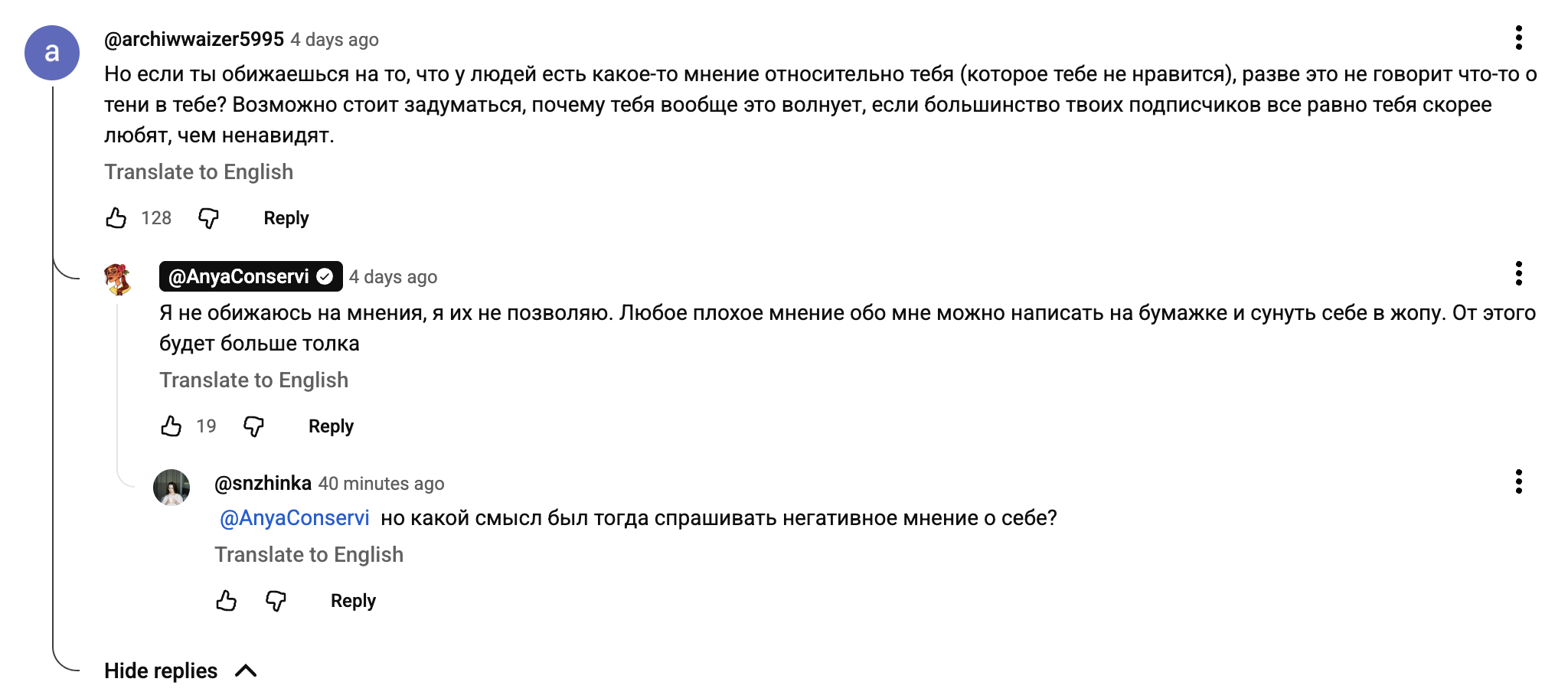 >>6325258 Буба кстати умело реагирует на хейт. Ей вот реально похуй, может чуть чуть поспорить, но она там обычно на личность комментатора не переходит, скорее защищается. Ну и вот эти консервские посылы нахуй за любую мелочь тоже отсутствуют