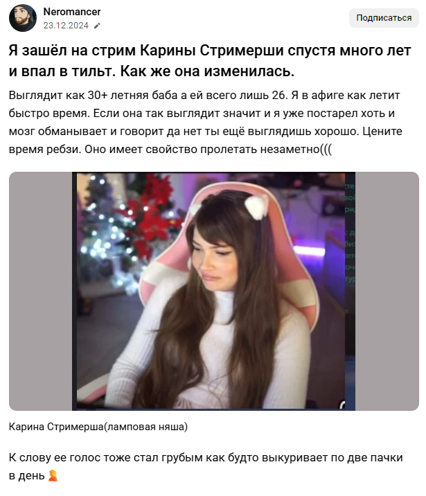 >>6325430 >>6325460 Это все от жизни со скуфом ебаным. Все девушки всратеют и шизеют от отношений с хуйлом сильно старше и всратее себя, а ей и 18 не было, когда с боровом рыжим связалась