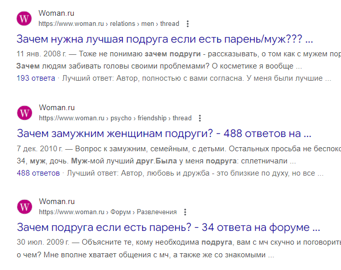 >Не нужны никакие подруги - лучший друг для меня это муж. >Я вот всю жизнь не особо общительная, скорее интроверт по натуре. Подружки и раньше иногда напрягали, а когда вышла замуж, так и вообще отпала необходимость в общении с ними. Мне со своим мужчиной комфортно и общаться, и развлекаться, и по магазинам ходить.