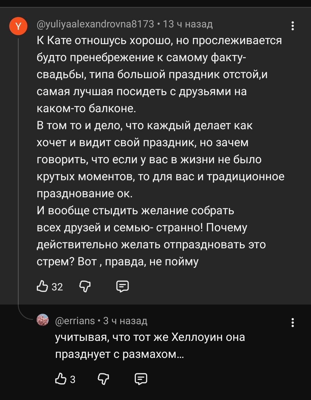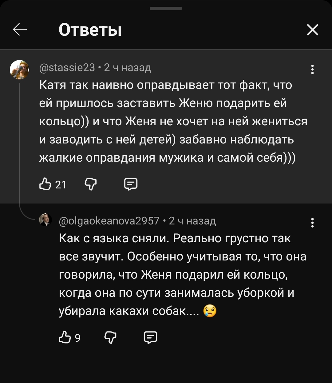 Соглашусь. Есть несколько знакомых парочек, которые давно живут вместе. Девушки очень хотят заветное предложение, а парни наоборот отнекиваются, что это всё не нужно, и так ведь всё хорошо. Тоже как говжен не понимают зачем нужны эти ваши свадьбы и браки, хотя им вся родня с обеих уже давно мозг выносит когда свадьба. Один сказал «если решим разойтись, то просто разойдёмся, не надо будет разводиться и пилить имущество, удобно». То есть отношается и живёт с девушкой, а уже подспудно думает как им разойтись, лол.