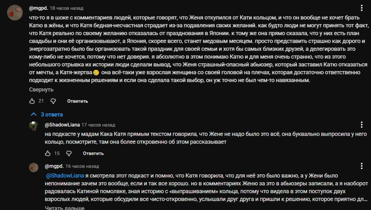 >>6327446 Катя классическая «удобная» девушка, во всем стелится под своего Женька. Наверное у нее такое воспитание, что женщина должна быть мудрой-понимающей плюс она жертва либеральной пропаганды, где надо обо всем договариваться и быть Мега осознанной. Помню, была такая инфо циганка, Мила Левчук, которая учила дать женщиной плюс. Тоже полная дичь, но было здравое зерно в ее теории, что не надо до свадьбы с мужчиной жить, иначе мужчина посчитает тебя удобничихой и не захочет брать ответственность, и так же удобно.