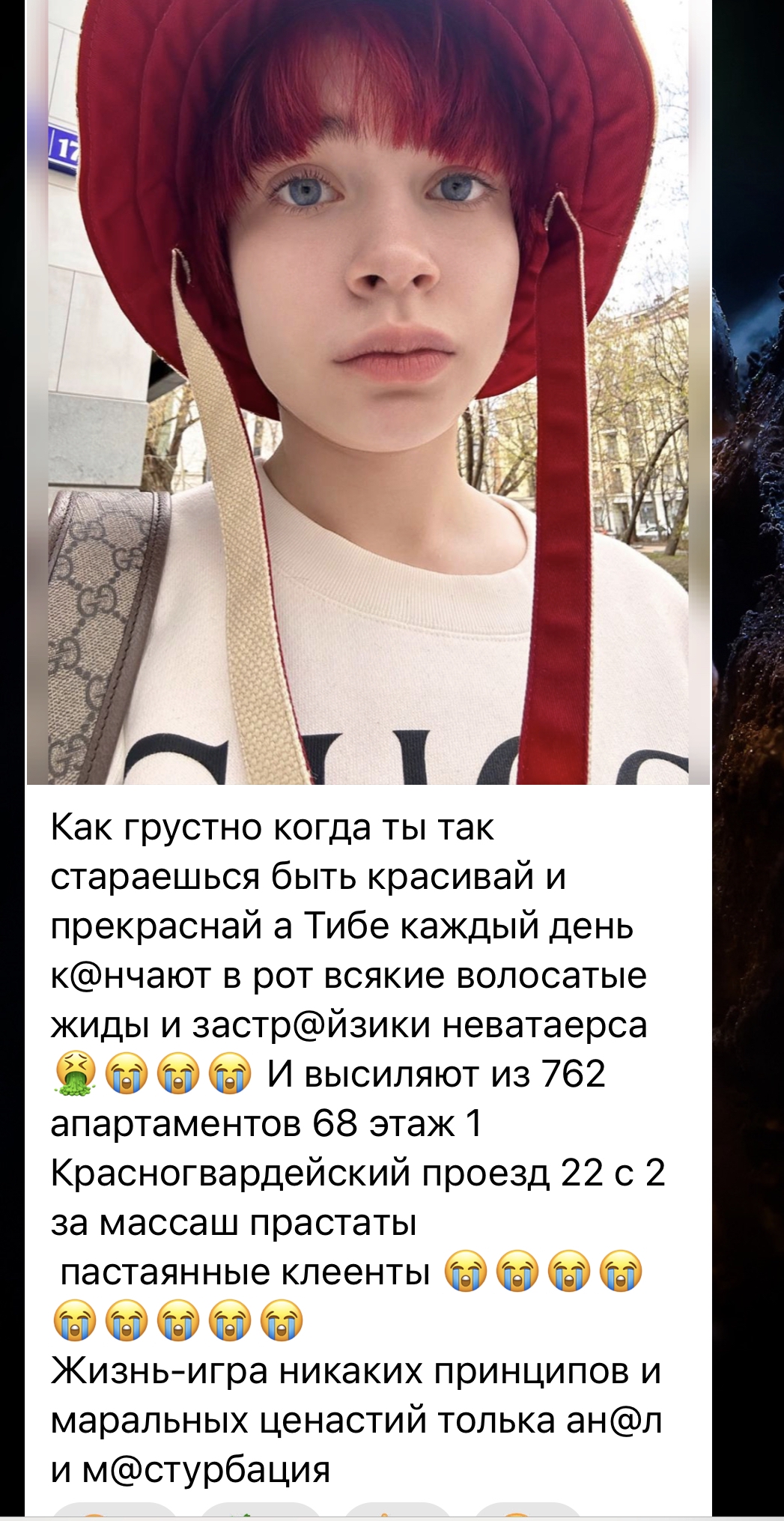 >>6330078 Она всегда щитпостила постироничной хуйней про ж@@ов и тд. Когда ее выселяли из прошлых аппартов она постоянно снимала видосы и относительно норм себя на них вела, рассказывала ситуацию, пыталась выходить на диалог с ж@@ом, который её выселял. У нее определенно беды с бошкой, о чем она сама говорила, но высеры в блогах это реально щитпост и в ирл она может вполне адекватно общаться