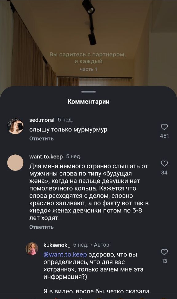 "Он такой, потому что ты не даёшь ему проявить себя. Не даёшь ему желанное отцовство. Родила не тех детей. Навесила на шею своих спиногрызов. Подрезала крылья, навязав семью. Бросила на произвол судьбы, разведясь". И женщины мечутся, спасая отношения, пытаясь понять, объяснить себе и ему, рожают детей, потом тащат этих детей на себе, забивают на свою карьеру и амбиции, потом бегут на работу, чтобы кормить семью, ведь кукусику тяжело.