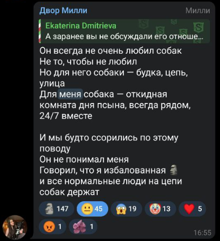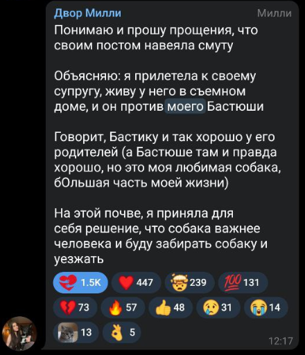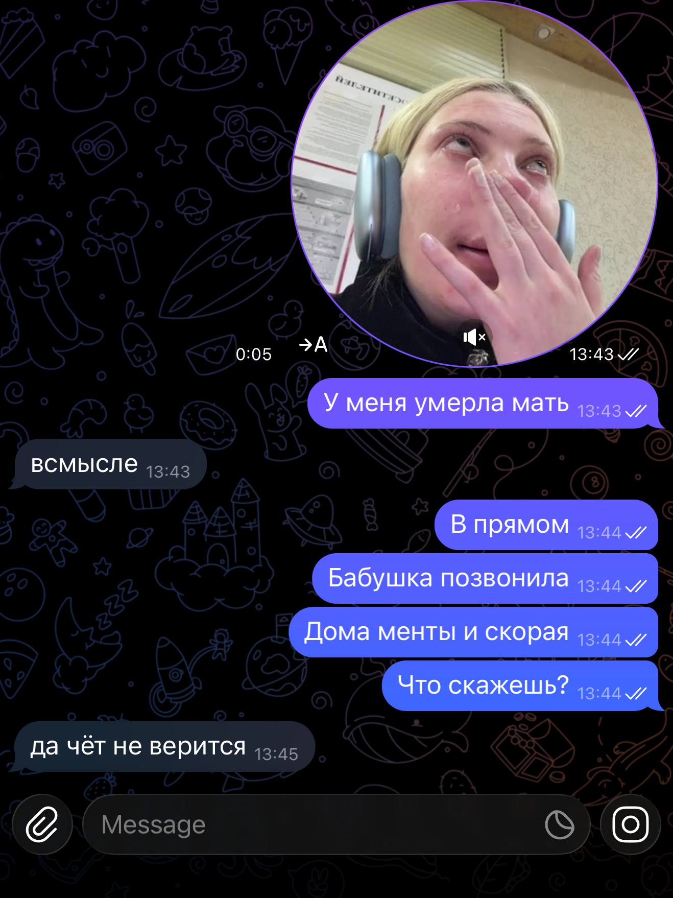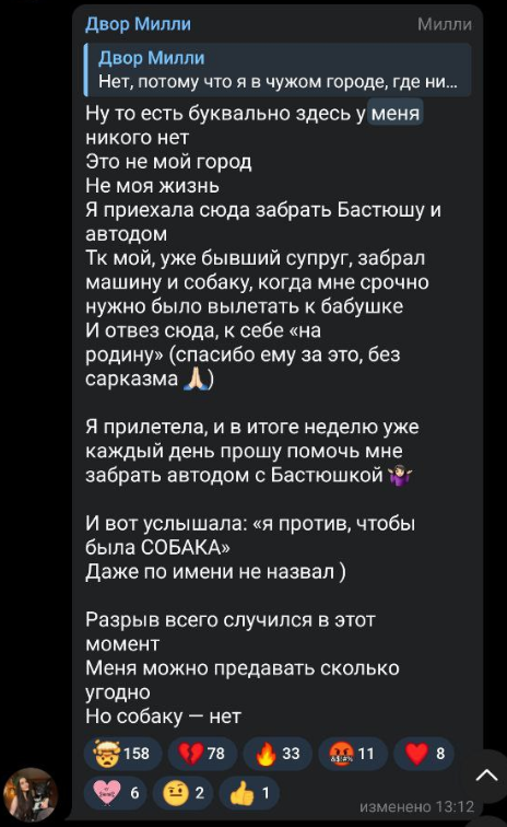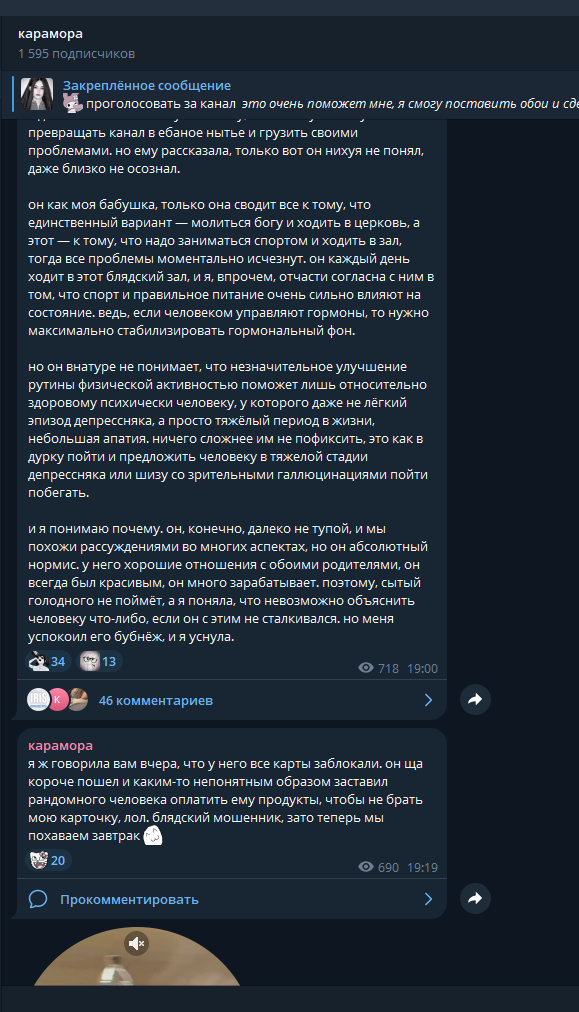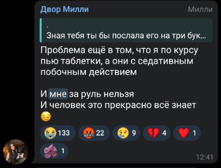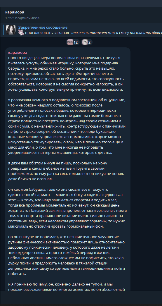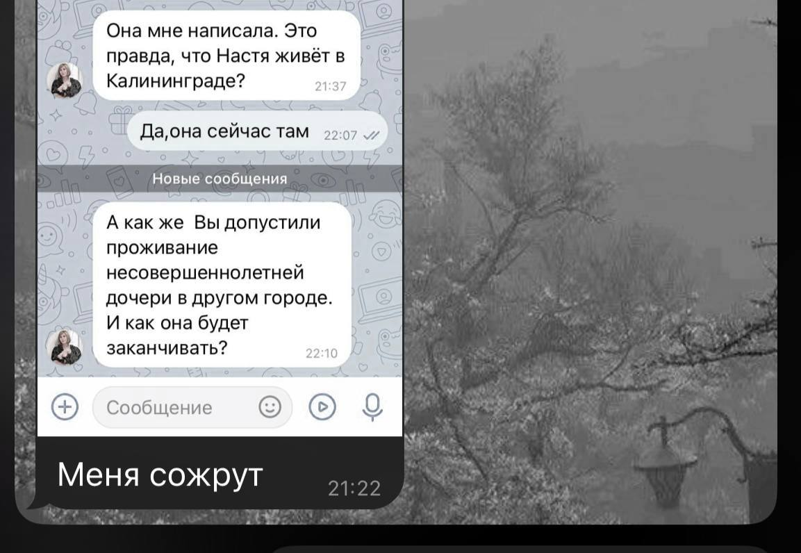 >>6332247 ну и вот скрин сообщения от матери караморы, которое она прислала ей, когда та сказала учительнице что не будет писать сочинение итоговое в 9 классе потому что переехала. реакция странная, но точно не агрессивная. можно сделать смутный вывод что у нее странноватые родители, которые ей доверяют и позволяют все. вообще мне интересно, правда ли они знают что дочь проститутка, или карамора это говорит, чтобы избежать сливов на себя родакам