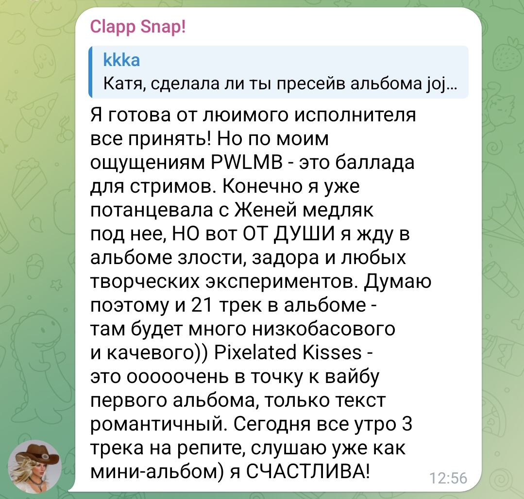 >>6333125 >>6333108 Я и в кейпоперскую любовь не верю. Та же Авеми Лисса, Соня Хромова... Ну с Лиссой понятно, что неискренная хайпожорка, а Хромова умная и тоже тащится по этому говну. Я много песен переслушала корейских, ну ни одна не зацепила