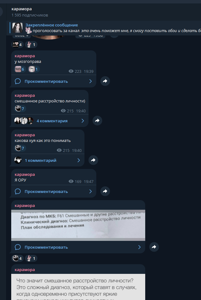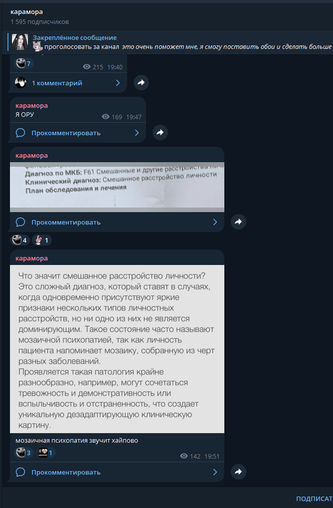 >>6330727 Карамора написала, что ей поставили смешанное расстройство личности и что типа она психопатка сюмаседсяя) По факту этот диагноз ставят всем, у кого особо нет патологий, лишь бы было что поставить. Алсо она с помощью приложения вычислила писюху из анонки, которая писала ей гадости, и выставила ее фотку чтобы поржать. Ухты она была сумасшедшей психопаткой которая легко вычисляла недоброжелателей, у нее были связи и влияние…….. она такая необычная. Боюсь что меня теперь вычислят не надо пожалуста(