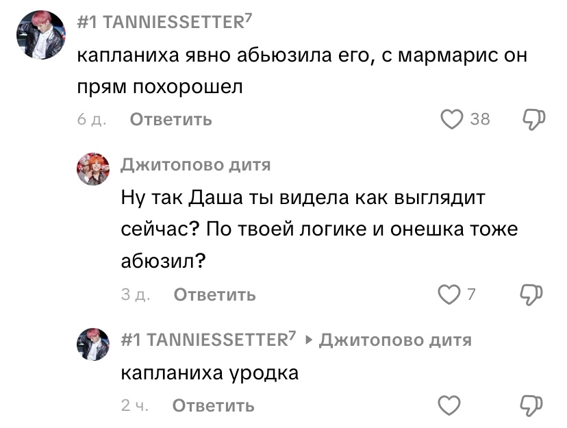 сама пернула сама понюхала. никто и не называл ее так, это она все строит из себя одноклеточное альтушачье дитя инцеста с ебанутыми макияжами на самом деле приятно видеть, как она огребает внешне и внутренне. не прошло и 4х лет усатой любви, а уже проблема на проблеме, бедолго
