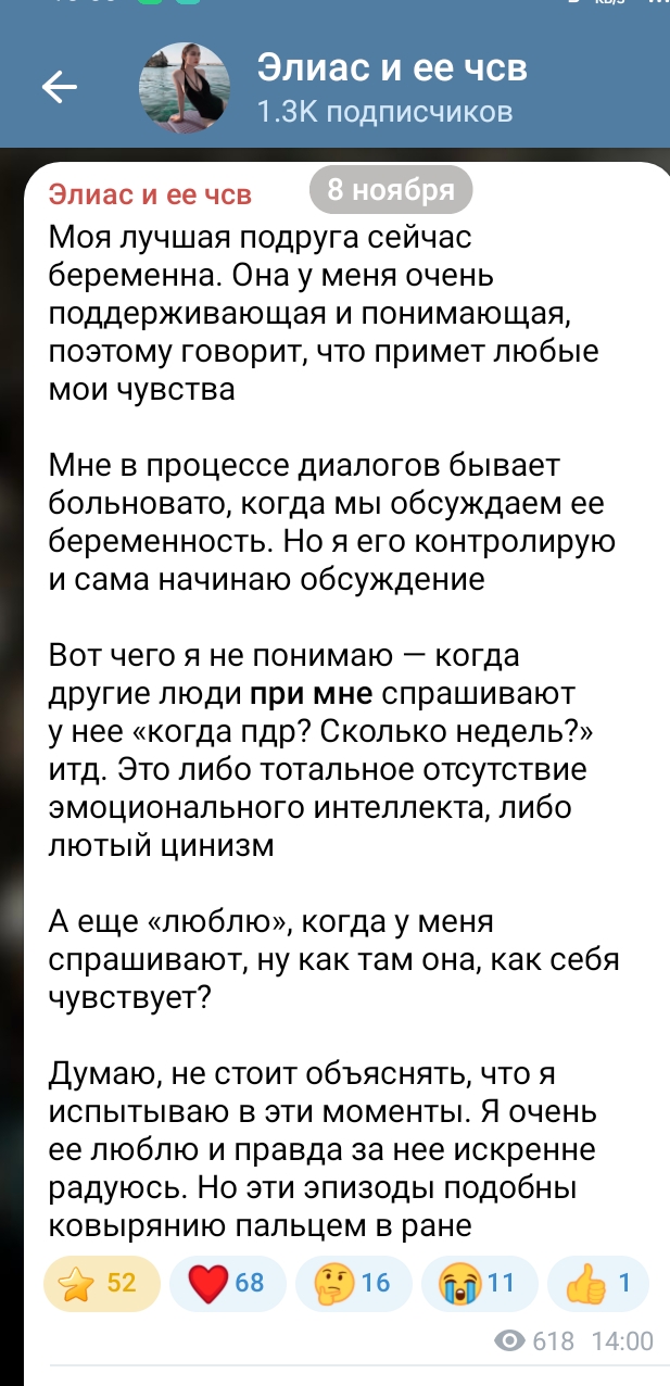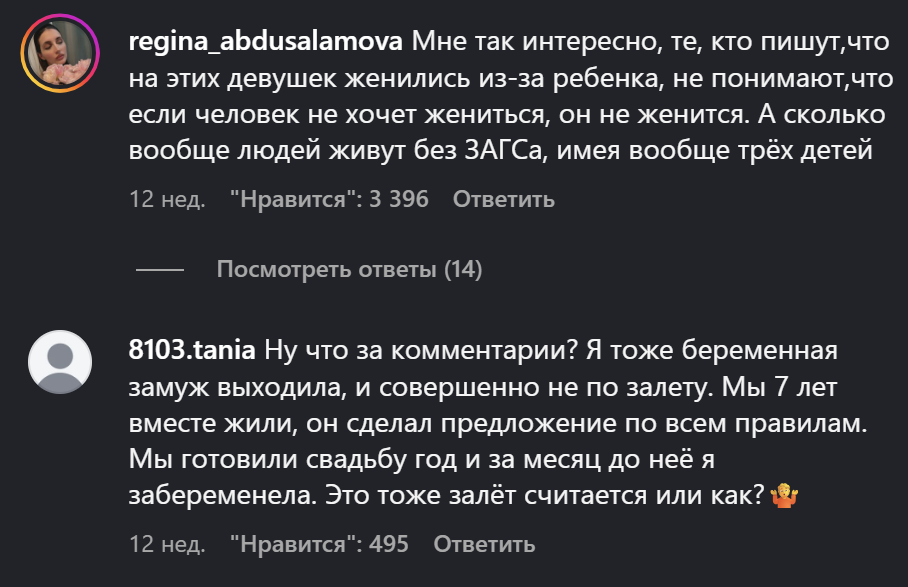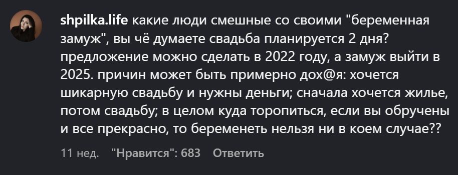 "Нет, ну а чего ты ждёшь с браком и детьми? Ну он не готов, а кто из мужиков готов? Они никогда не готовы, а ты что хотела? Так всю жизнь прождешь, пока готового найдешь. Ну надо как-то подвести к этой мысли, а уж ребёночка как-нибудь сообразите!". Ну да, а потом "куда ты смотрела, когда от него детей рожала? По нему сразу было видно, что папаша из него, как из говна пуля".