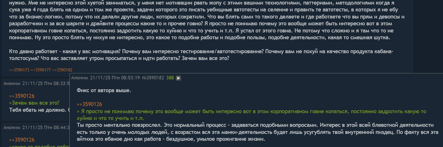 >>6344514 Ну тут чел честно пишет, что он не понимает, частью какой системы он занимается, для чего она создается. В этом его проблема. Конечно, мотивации так не будет. Вон, я сколько читала дискуссий, вроде у нас народ не особо морализмом страдает, но в букмекерские конторы и микрозаймы даже с зп x1.5 люди неохотно идут. Всем немаловажно, над чем именно ты трудишься.