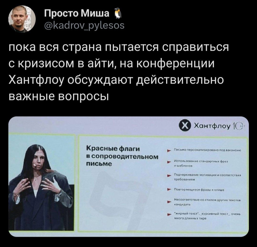 >>6346634 И требования были адекватные. А не поиск человека-окрестра. В это время госухи и прочие страдают еженедельным выкладыванием одной и той же вакансии месяцами, ИИ-ассистентами хр, отсутствием вилки, офисом, игнорированием резюме в принципе и отсутствием отказа как такового, просто вакуху удаляют. Вот кто тут настоящий скамер.