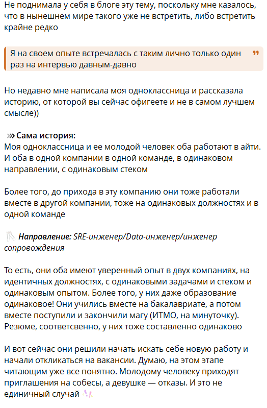 >>6358799 там копнёшь глубже историю этих айти-тян, и выясняется что-то типа "ну да, у меня молодой человек директор айти-отдела, но какое это имеет значение ?", "ну я на собеседовании тимлиду понравилась, он на свидание звал, я не стала сразу отшивать, потому что невежливо" и тд.