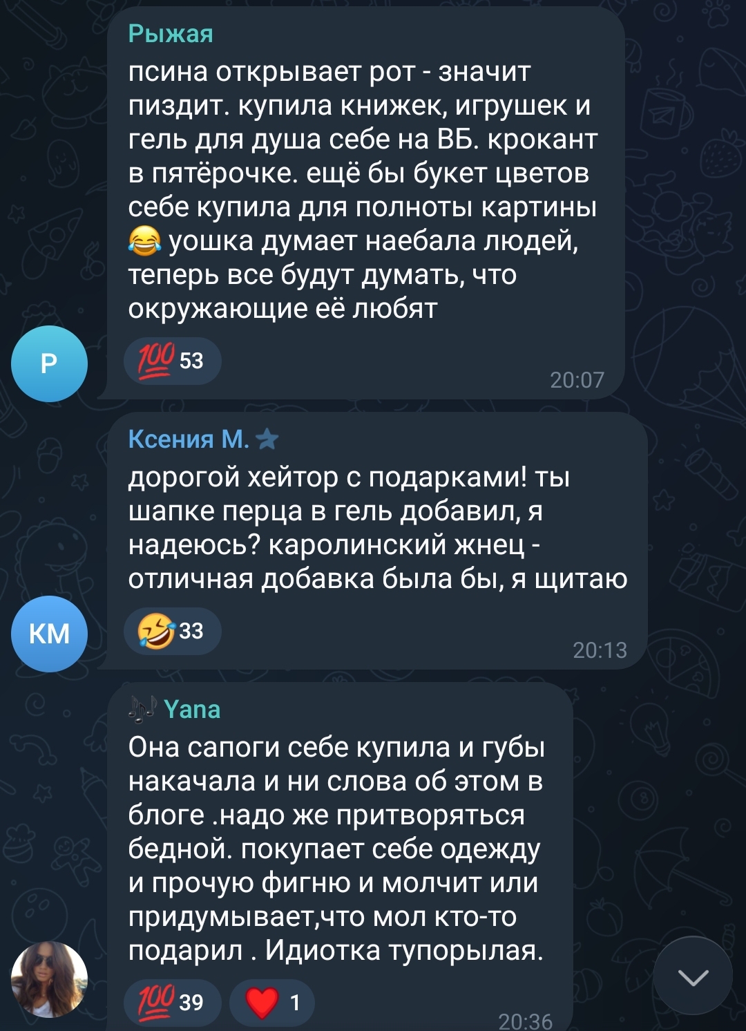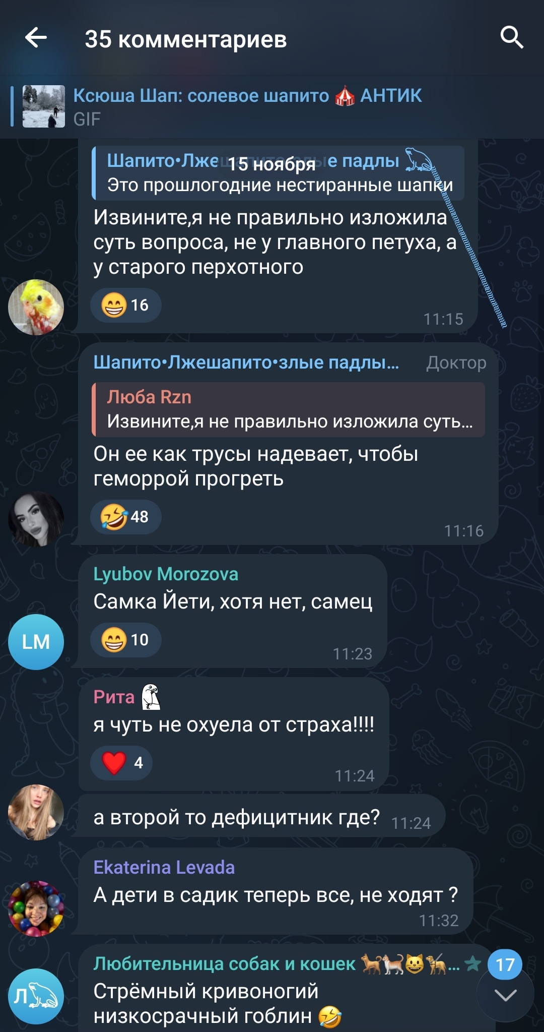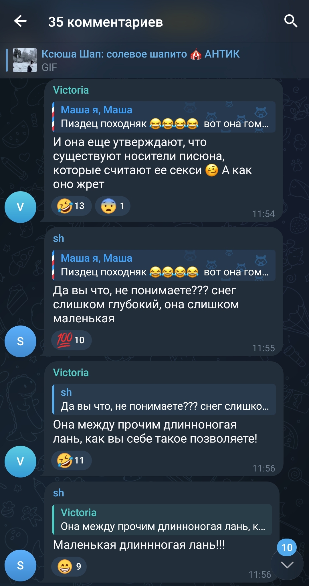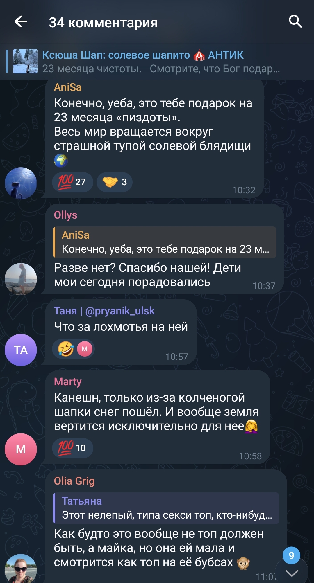 Иногда захожу во всякие антики в телеге и каждый раз удивляюсь, какие же нормиски здые. Сидят в антике со своего реального аккаунта, с фоткой своего ебала и генерируют уйму фантазий относительно объекта обсуждения. На дваче с полной анонимностью так людей страшно не срут, как это делают озлобленные нормиски в своих каналах. А то как они придумывают все эти оскорбительные словечки, ругательства и проч унизительные словосочетания я охуеваю и кринжую каждый раз. Скрины с антика ксюши шап