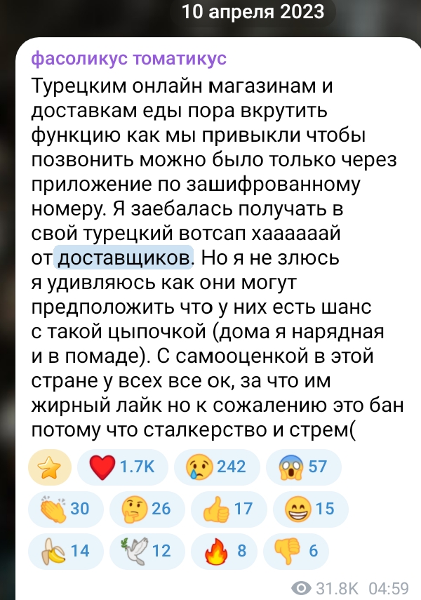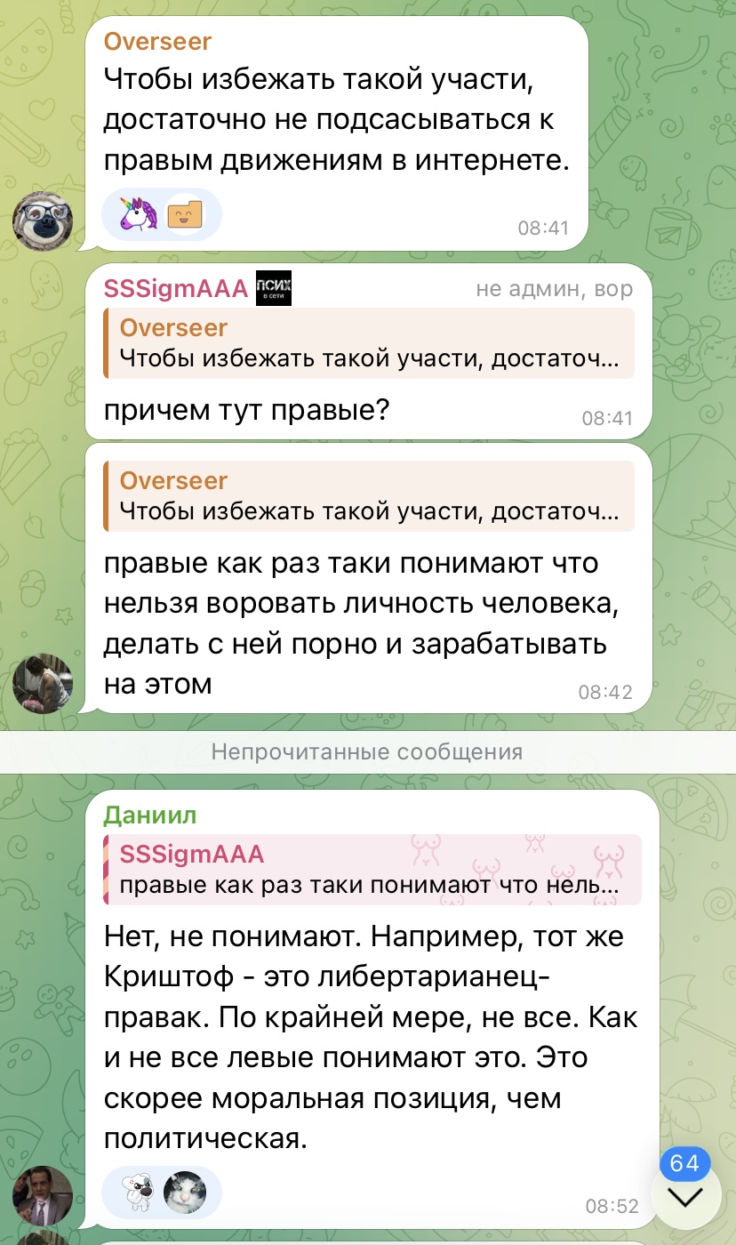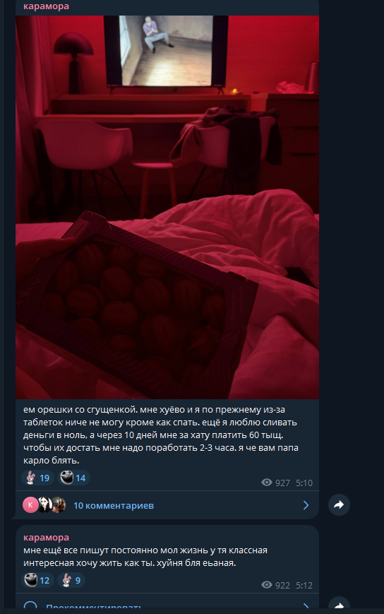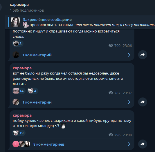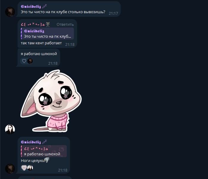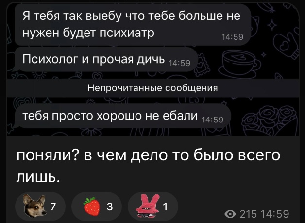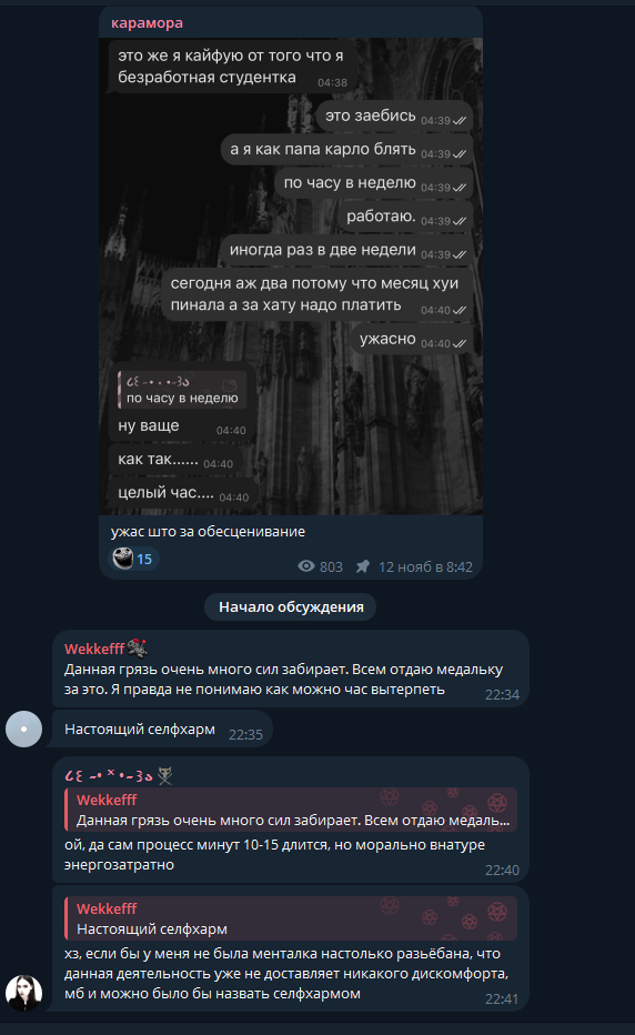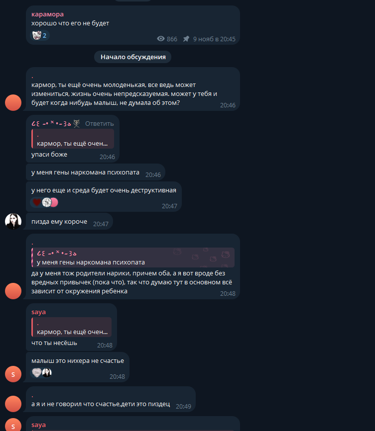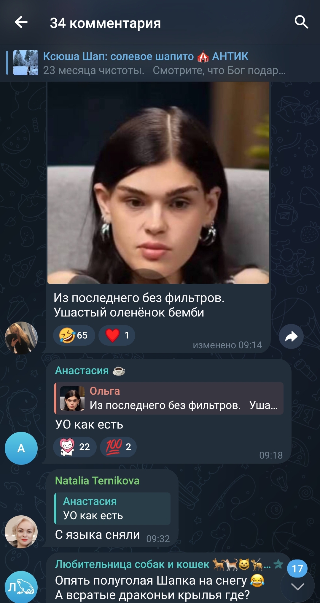 Иногда захожу во всякие антики в телеге и каждый раз удивляюсь, какие же нормиски здые. Сидят в антике со своего реального аккаунта, с фоткой своего ебала и генерируют уйму фантазий относительно объекта обсуждения. На дваче с полной анонимностью так людей страшно не срут, как это делают озлобленные нормиски в своих каналах. А то как они придумывают все эти оскорбительные словечки, ругательства и проч унизительные словосочетания я охуеваю и кринжую каждый раз. Скрины с антика ксюши шап