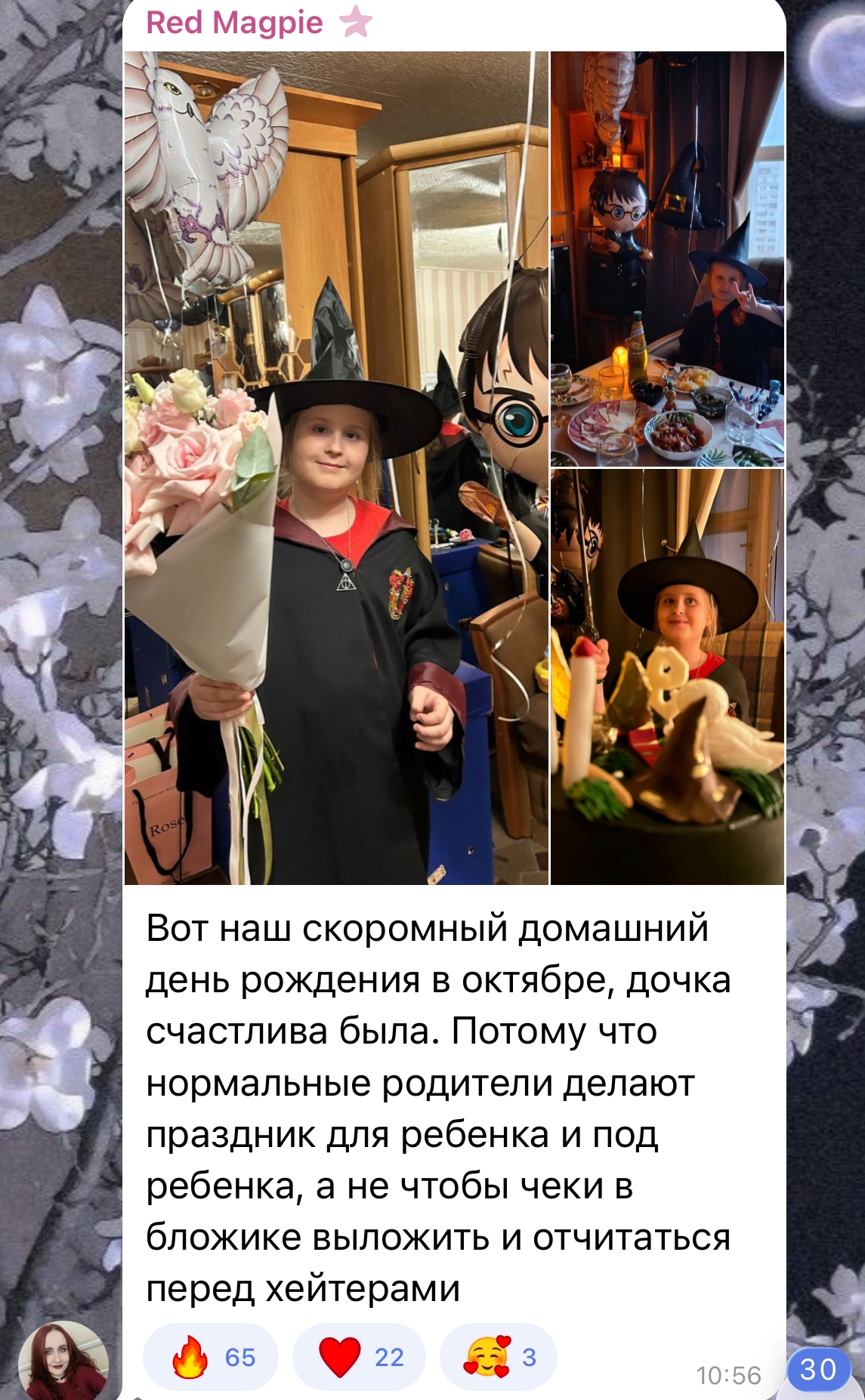 >>6338191 Одна из самых странных вещей, когда они кидают фотки своих детей в хейтерское сообщество солевой наркоши, чтобы выебнутся, что у них конечно денег таких на др ребенка нет, но зато др лучше сделали, уютнее. Зачем, блять? С тобой эта маман не спорит, ей поебать на тебя. И на детей своих и твоих ей тоже начхать. Слила 50к, потому что не хотела особенно возиться, а хотела фотки для блога. Они сами пишут, что сабж нарц, а потом начинают какой-то хуйней в нее кидаться типа др детей. Только шапка бабки зарабатывает на своем щитпосте с микрочелами, а эти бесплатно.