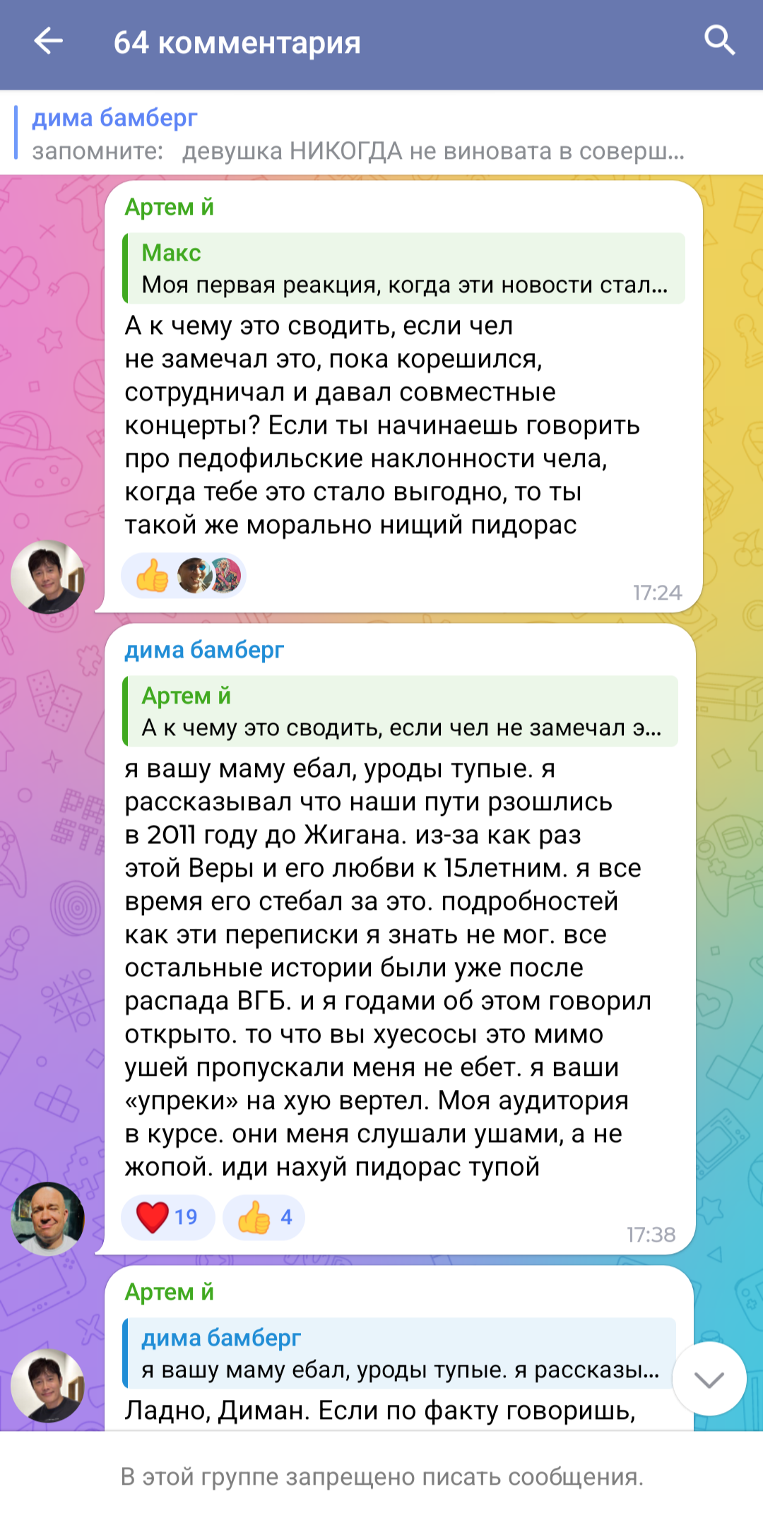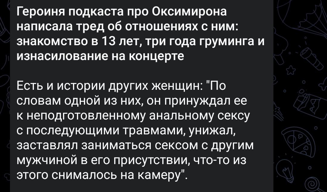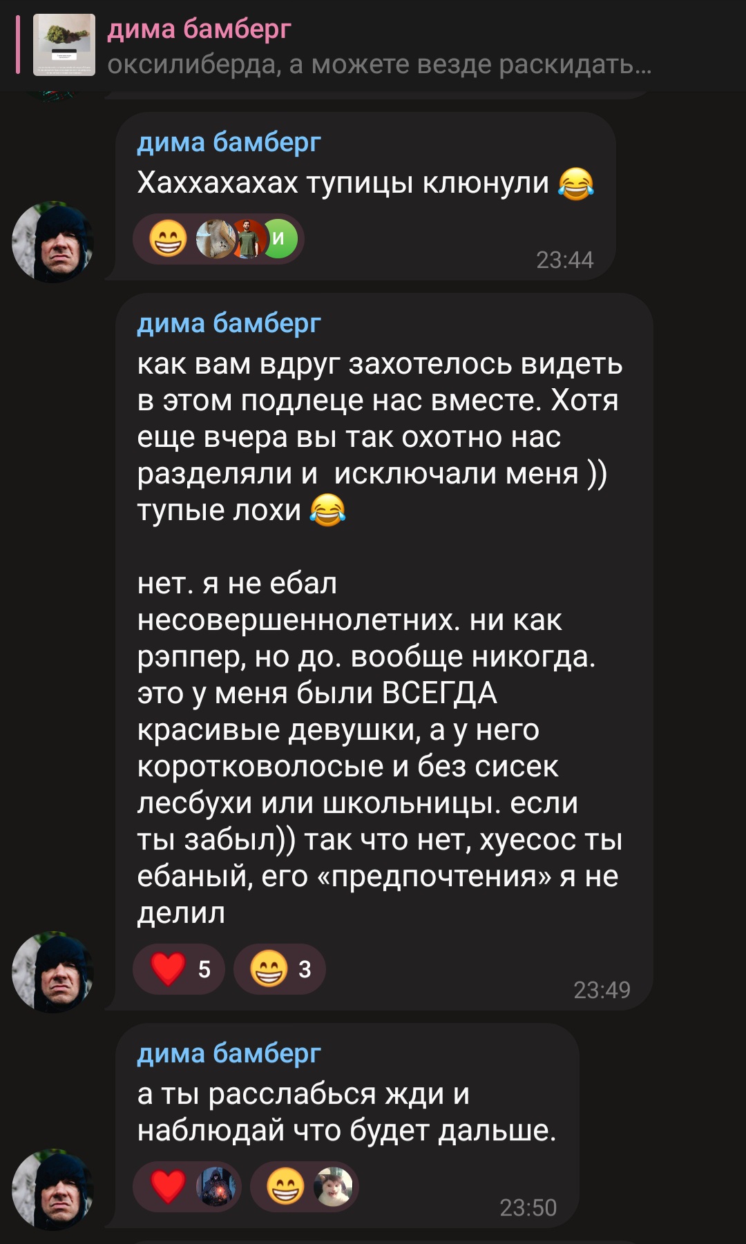 Всем привет! Не знаю приносили ли сюда эту инфу весной в период оксигейта, я вот только сейчас откопала эти видосы в старых тредах на хх. После подкаста Шокк начал активно высказываться о своем бывшем братишке педомироне, а потом поудалял почти все посты у себя в тгк, расфорсил срач с каким-то стримером Ростиком и закрыл комменты по сей день. Сейчас об этих педофильских моментах он помалкивает, только в одном посте недавно подъебнул Веру Маркович, что у нее не получилось разоблачить своего бывшего. У Собчак просил 4 ляма за эту инфу и Красильникова ему писала, тоже требовал бабки, но сколько неизвестно. Короче, походу есть что Димке терять. Думаю, что он сам же и участвовал со своим братом по разуму в оргиях с малолетками, или может просто снимал на видео, но все равно это делает его соучастником. В 2011 году после налета Жиган спиздил его айфон, на котором по его словам были очень интересные фотографии, а в 2021 пидессе Антону С слили инфу про бывшую эскортницу педокси, которая много что узнала из его жизни. Пиздец история конечно, больше узнаешь и еще больше охуеваешь от этих ублюдков.