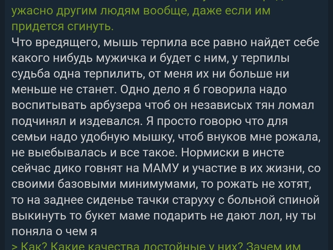 бля.. впсомнила марму зашла в тг.. верно бабки с багини говорят, что все чего она касается превращается в хуйню с алика.. особенно смешно смотреть на это фото и вспоминать ее слова "я с 20 лет хочу деетй"