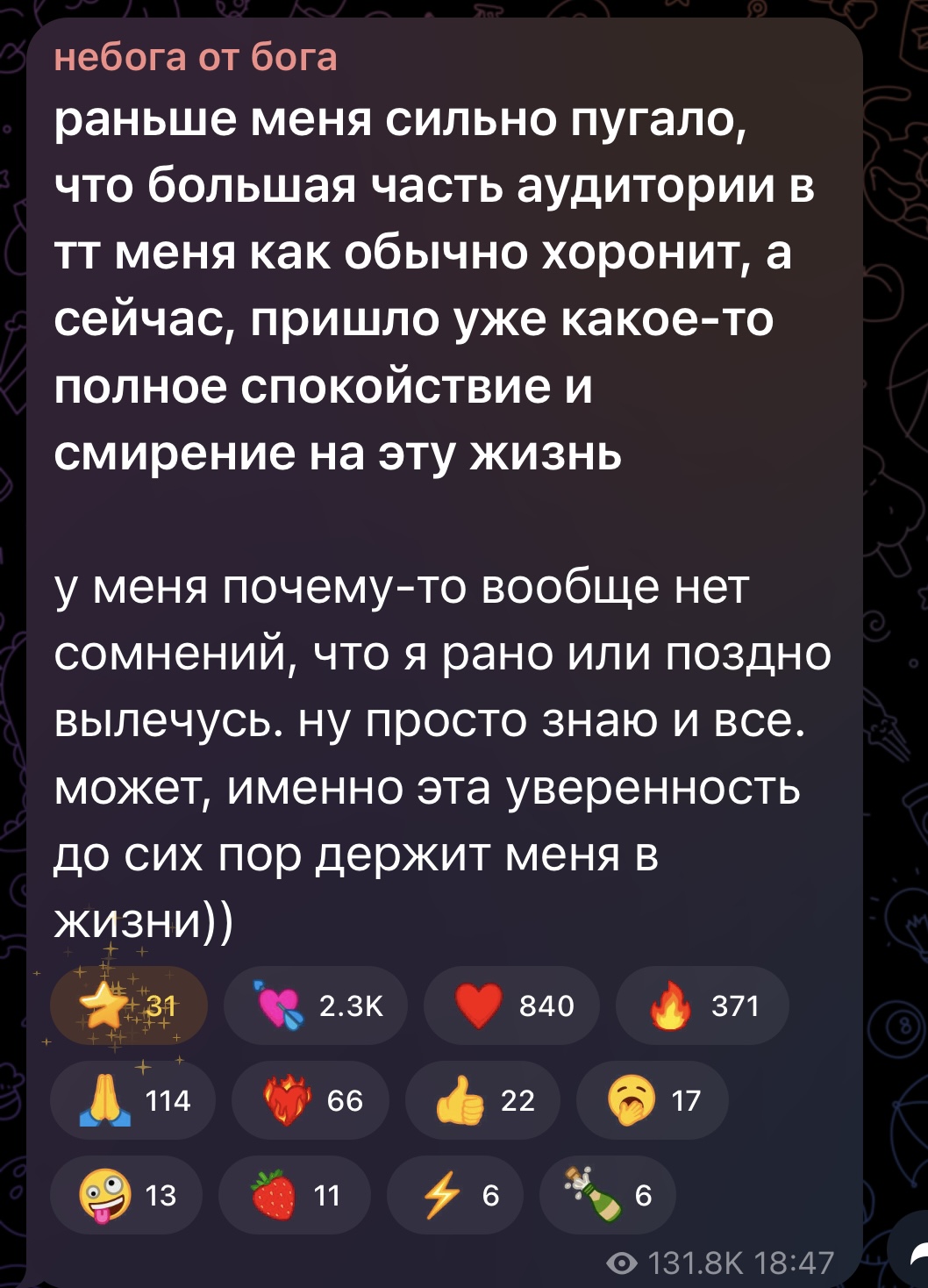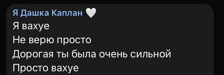 >>6339091 Я сейчас разревелась когда зашла на канал Иры. Последние посты такие жизнерадостные были, человек просто хотел дышать воздухом и гулять. >Попрощаться со мной вы сможете на следующей неделе, точную информацию дам позже, сейчас просто хотелось ещё раз выйти с вами на связь :( Представьте писать пост, зная, что вы умрёте через пару часов