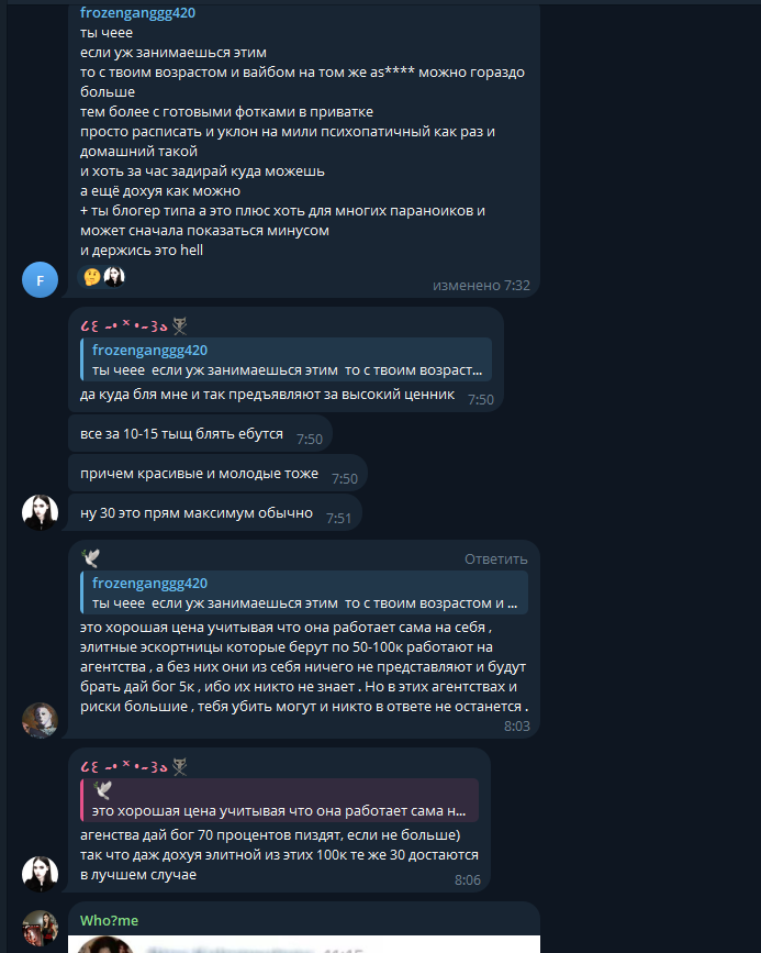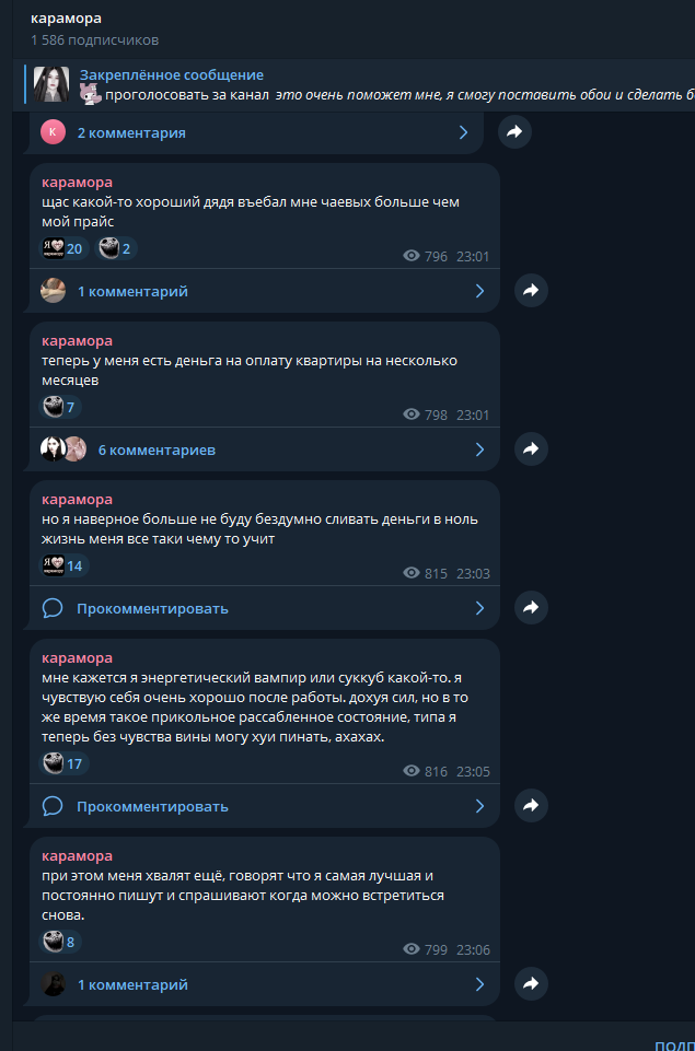 Алсо думаю медийные пацанки эскортниц только так заказывают. Мне кажется Костья-мальчек-внутри или нарциссиха Милас так вообще постоянные клиентки.